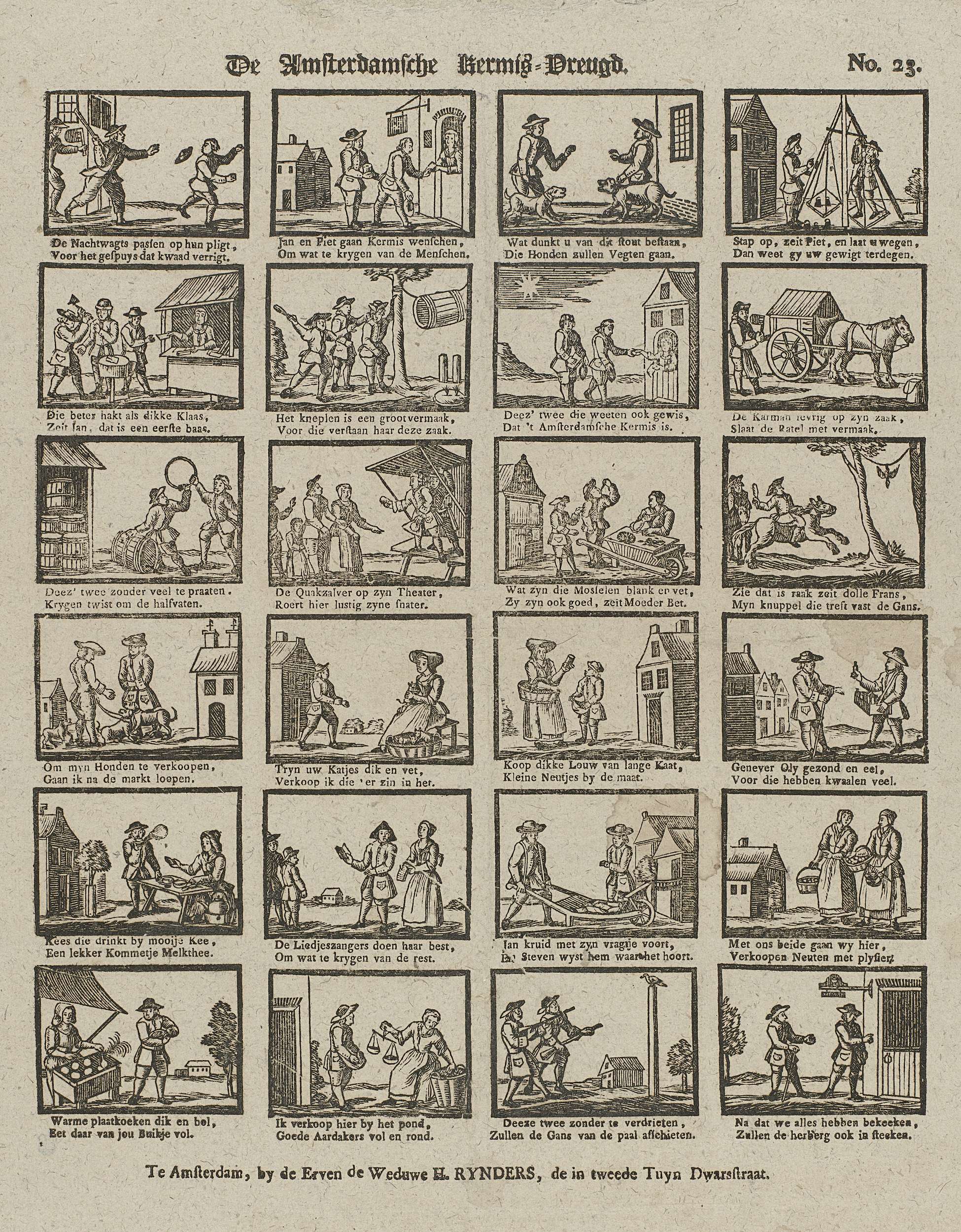 Blad met 24 taferelen op de Amsterdamse kermis. Onder elke afbeelding een tweeregelig vers. Genummerd rechtsboven: No. 23.