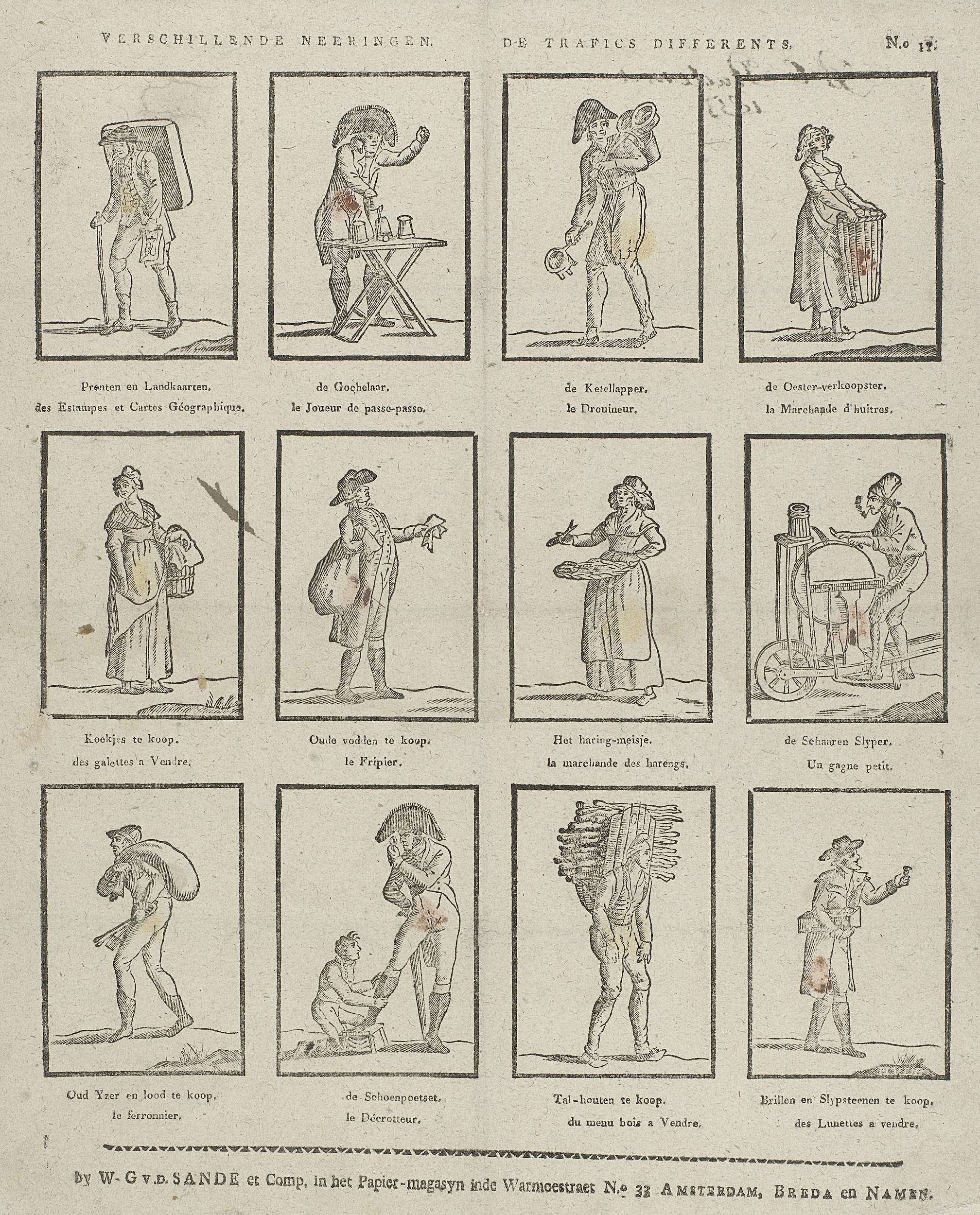 Blad met 12 voorstellingen van ambachtslieden en beroepen, zoals prentenverkoper, landkaartenverkoper, ketellapper, voddenverkoper, scharenslijper, schoenpoetser en brillenverkoper. Onder elke afbeelding een onderschrift in het Nederlands en in het Frans. Genummerd rechtsboven: No. 11.