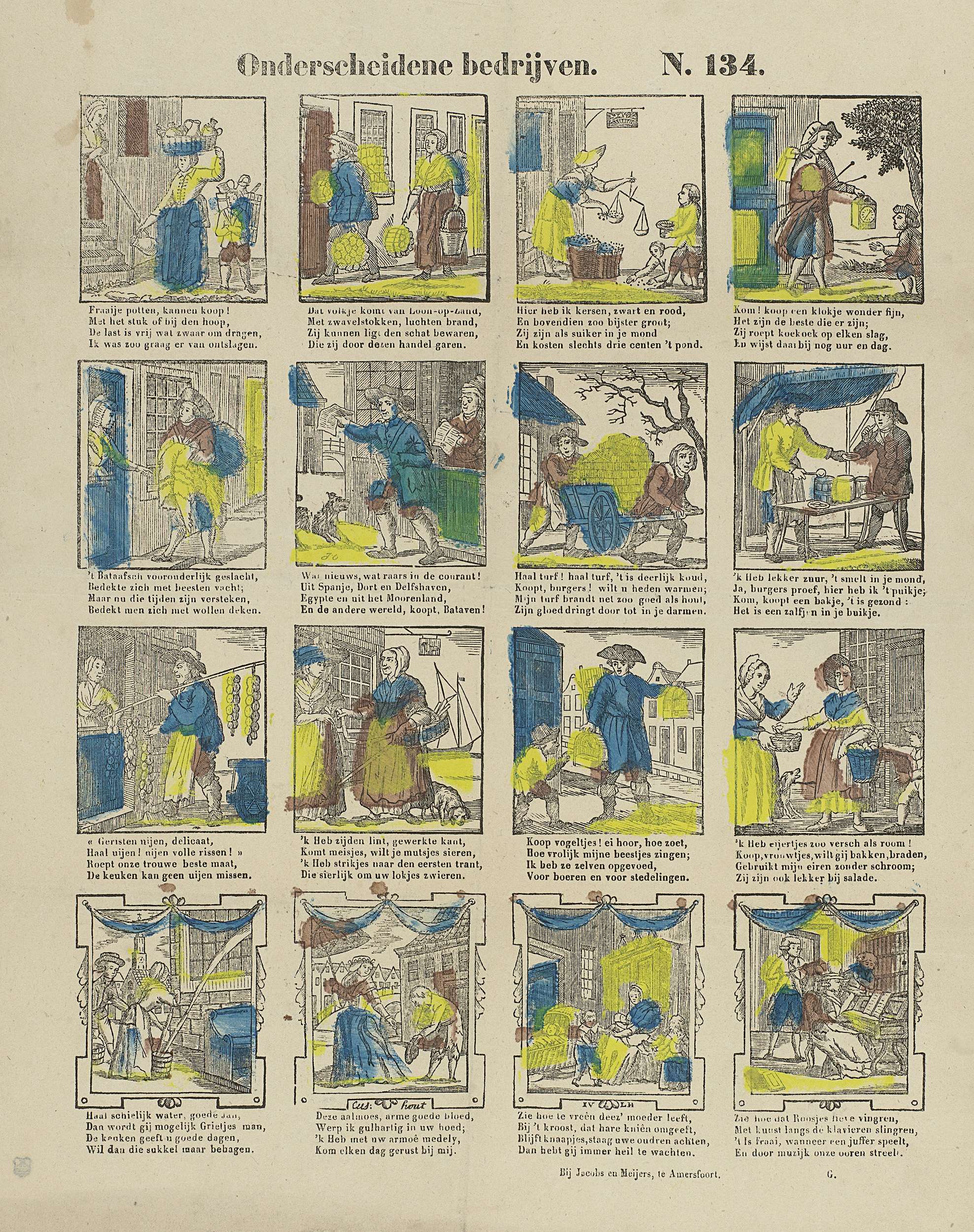 Blad met 16 voorstellingen van straatverkopers, zoals een klokkenverkoper, een krantenverkoper en een vogelverkoper. Onder elke afbeelding een vierregelig vers. Genummerd rechtsboven: N. 134.