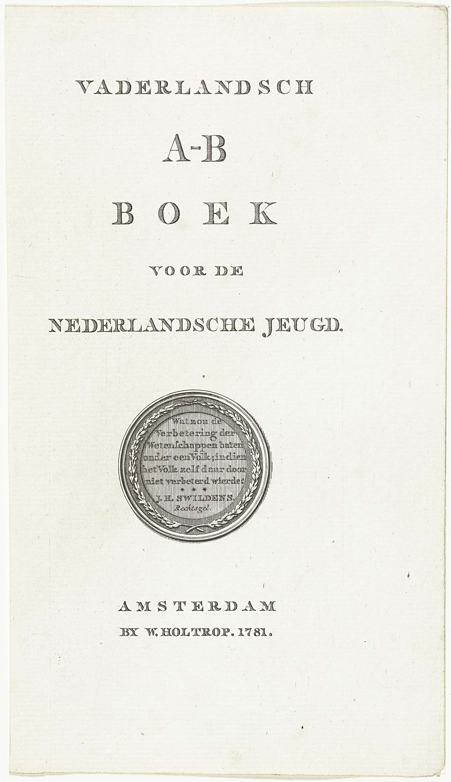 Titelpagina voor: J.H. Swilden, Vaderlandsch A-B boek, voor de Nederlandsche jeugd. Amsterdam: 1781