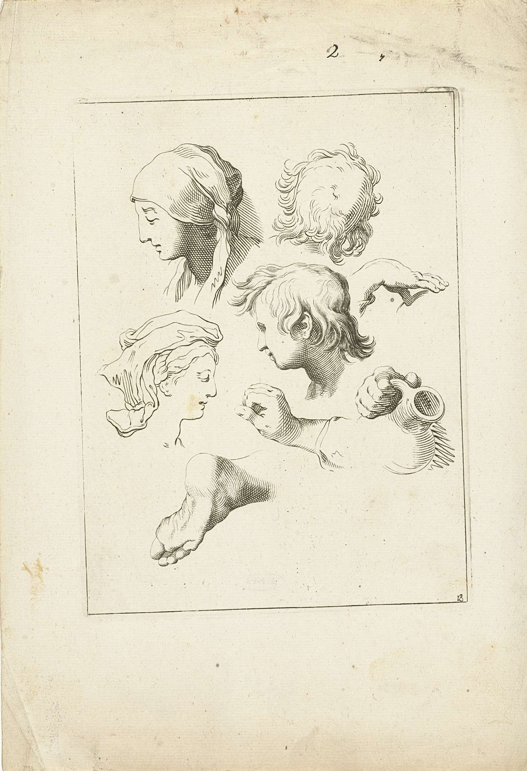 Studieblad met hoofden, handen en een voet. Kopie naar een voorstelling uit het tekenboek van Abraham Bloemaert, in de editie van Nicolaas Visscher. Genummerd 18.