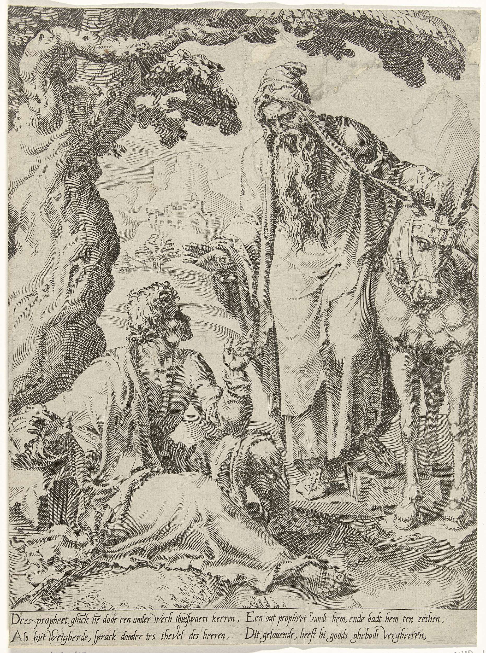 De godsman zit onder een boom. Een profeet uit Betel komt op een ezel langs en nodigt hem uit om in zijn huis te komen eten (1 Koningen 13: 11-18). Hoewel God hem dit verboden heeft, gaat de godsman akkoord. De prent heeft een Nederlands onderschrift op rijm en maakt deel uit van een vierdelige ...