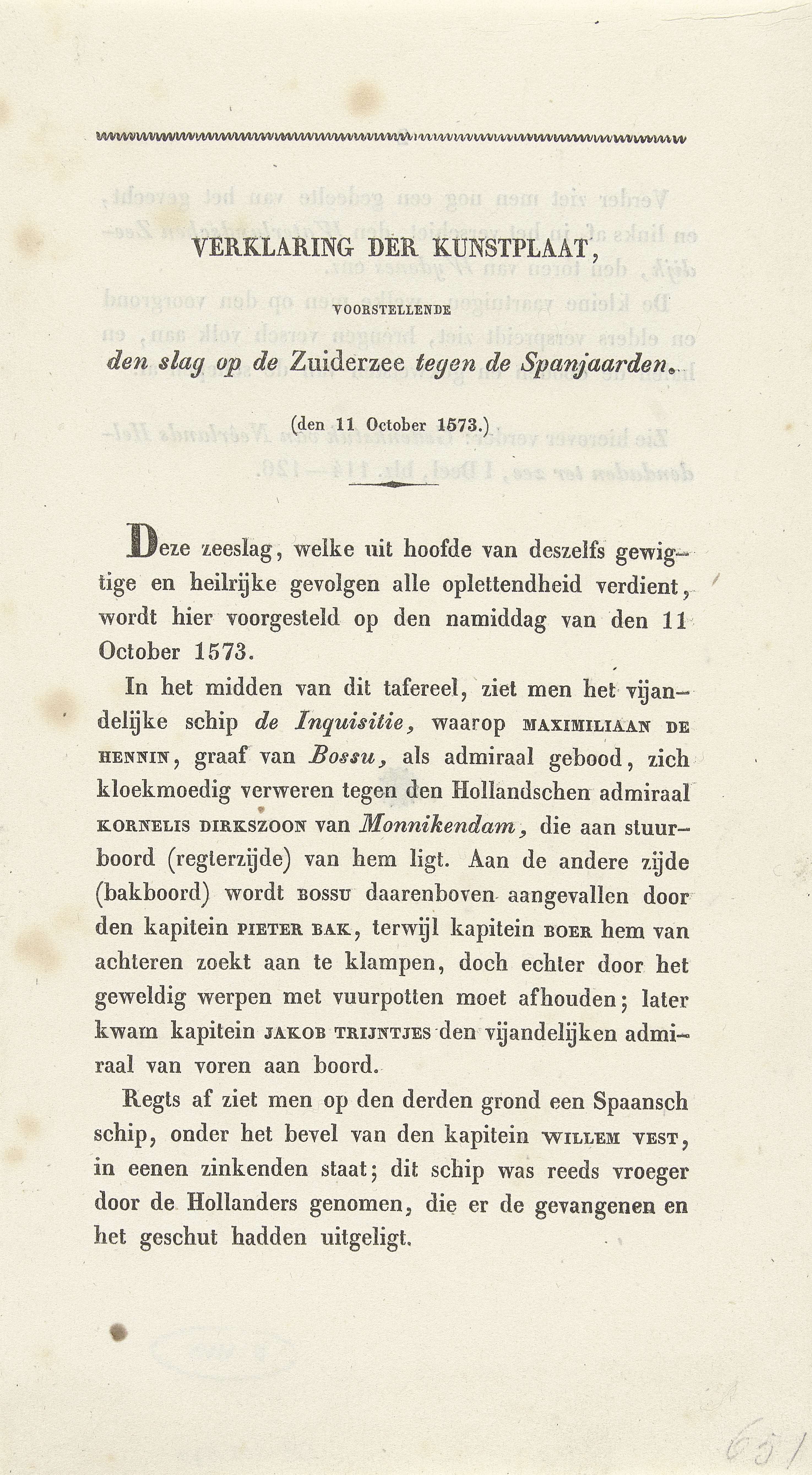 Op recto en verso van het blad een tekst in boekdruk over de prent met het onderwerp de Slag op de Zuiderzee van prentmaker Walraad Nieuwhoff.