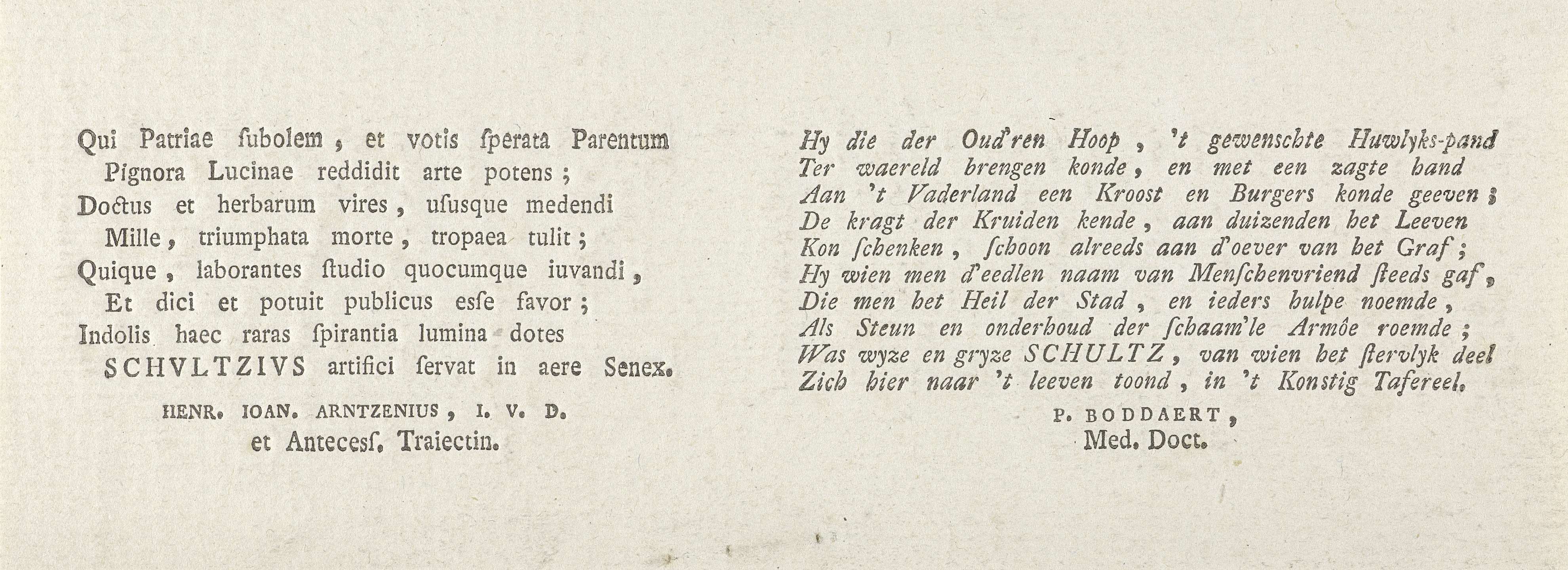 Tekstblad met een achtregelig gedicht in het Latijn en een tienregelig gedicht in het Nederlands over Henricus Schultz. De tekst hoort bij het portret van Henricus Schultz door P.H. Jonxis.
