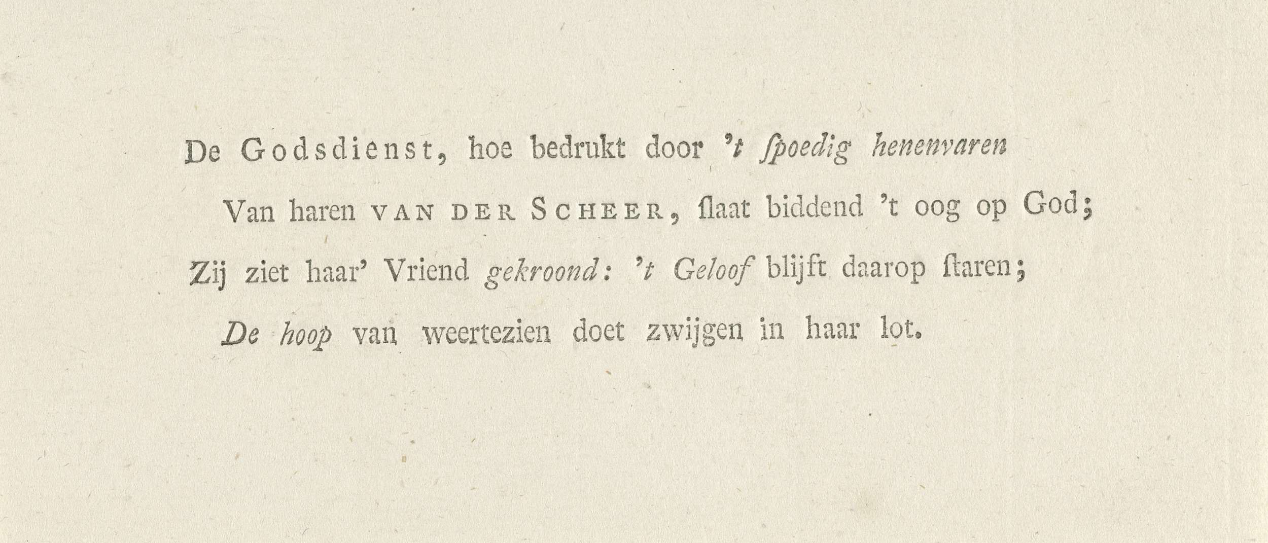 Tekstblad met vierregelig vers naar aanleiding van het overlijden van Adolf Frederik van der Scheer, hervormd predikant te Amsterdam. Mogelijk na zijn overlijden toegevoegd aan de prent ter nagedachtenis van zijn 25-jarige jubileum als predikant.