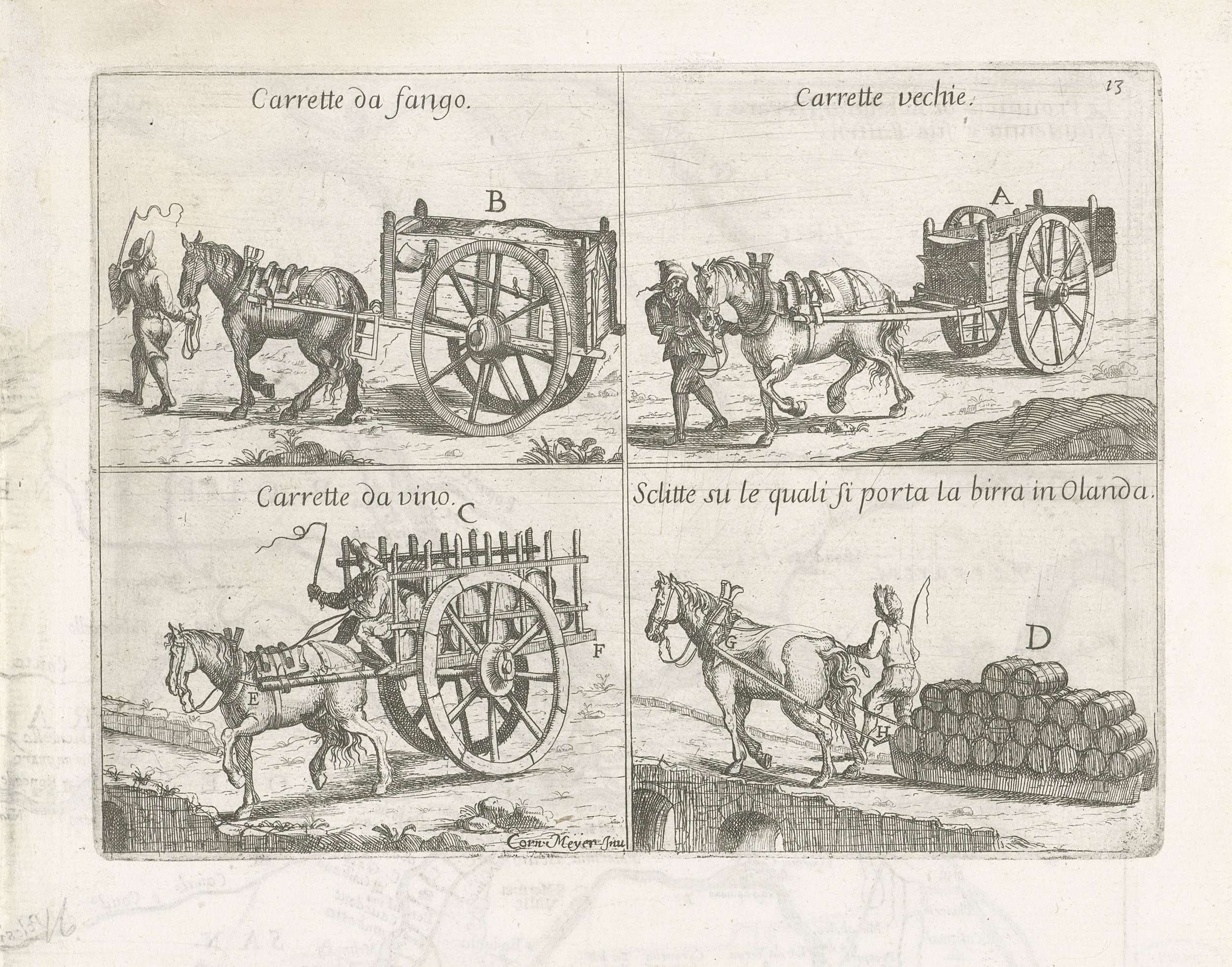 Vier verschillende karren, die door een paard worden getrokken. Linksboven een kar, waarmee zand wordt vervoerd. Rechtsboven een oude kar. Linksonder een kar, waarop wijnvaten worden vervoerd. Rechtsonder een Nederlandse slee, waarop biervaten worden vervoerd.