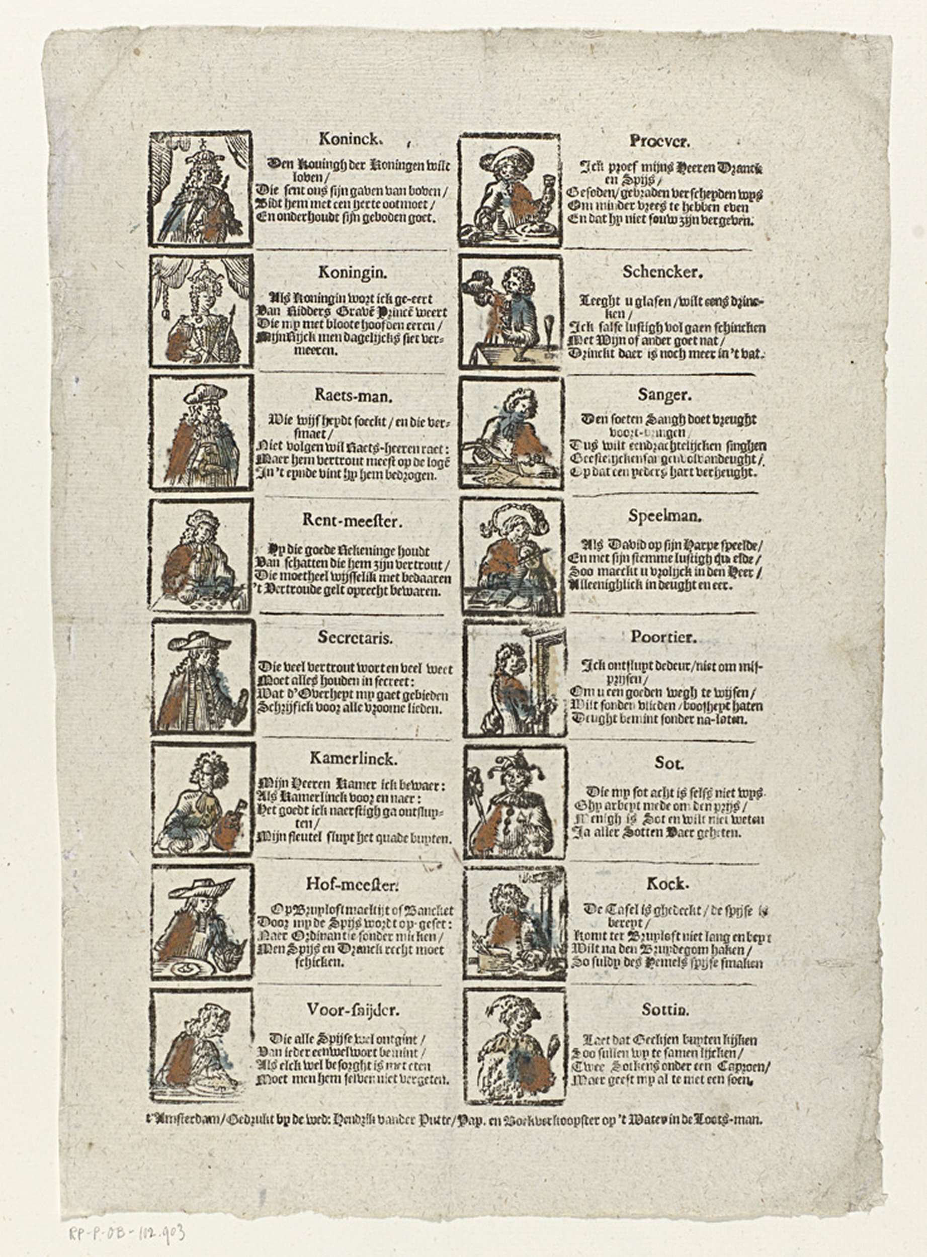 Blad met 16 voorstellingen (driekoningenbriefjes) van verschillende functies binnen het hof, waaronder een raadsman, een proever en een portier. Rechts naast elke afbeelding een vierregelig vers.
