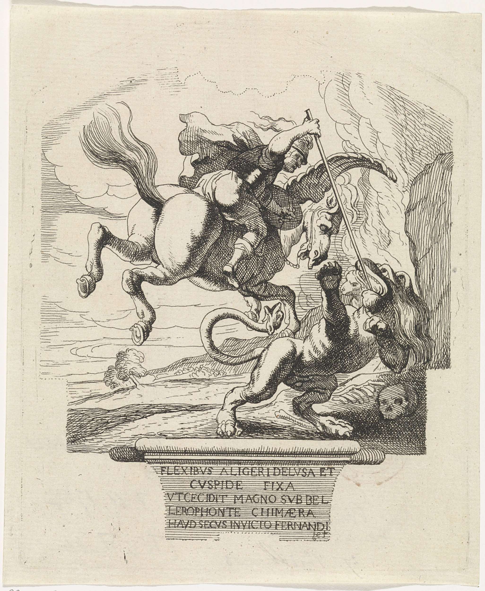 Bellerophon op het vliegende paard Pegasus doodt de Chimaera. Met onderschrift van vijf regels in het Latijn. Kopie naar een illustratie van de hoofdvoorstelling op de achterzijde van de triomfboog bij de Sint-Michielsabdij, opgesteld in de Sint-Michielsstraat, ter gelegenheid van de intocht van de Kardinaal Infant Ferdinand van Oostenrijk te Antwerpen op 5 mei 1635 ...