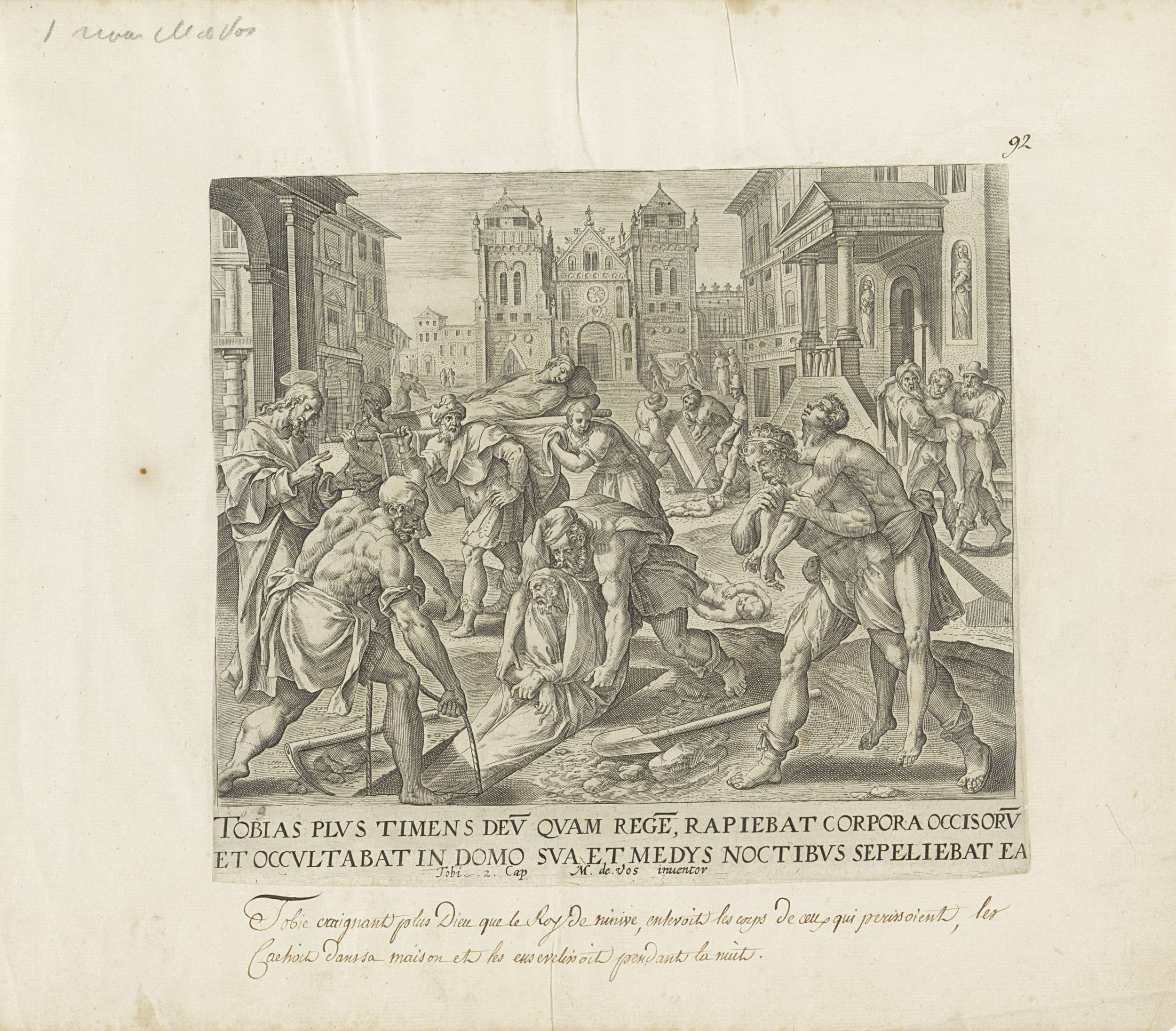Tobit en zijn vrienden begraven de doden in Nineve. Christus staat links en maakt een zegenend gebaar. Onder de voorstelling een verwijzing in het Latijn naar de Bijbeltekst in Tobit 2.