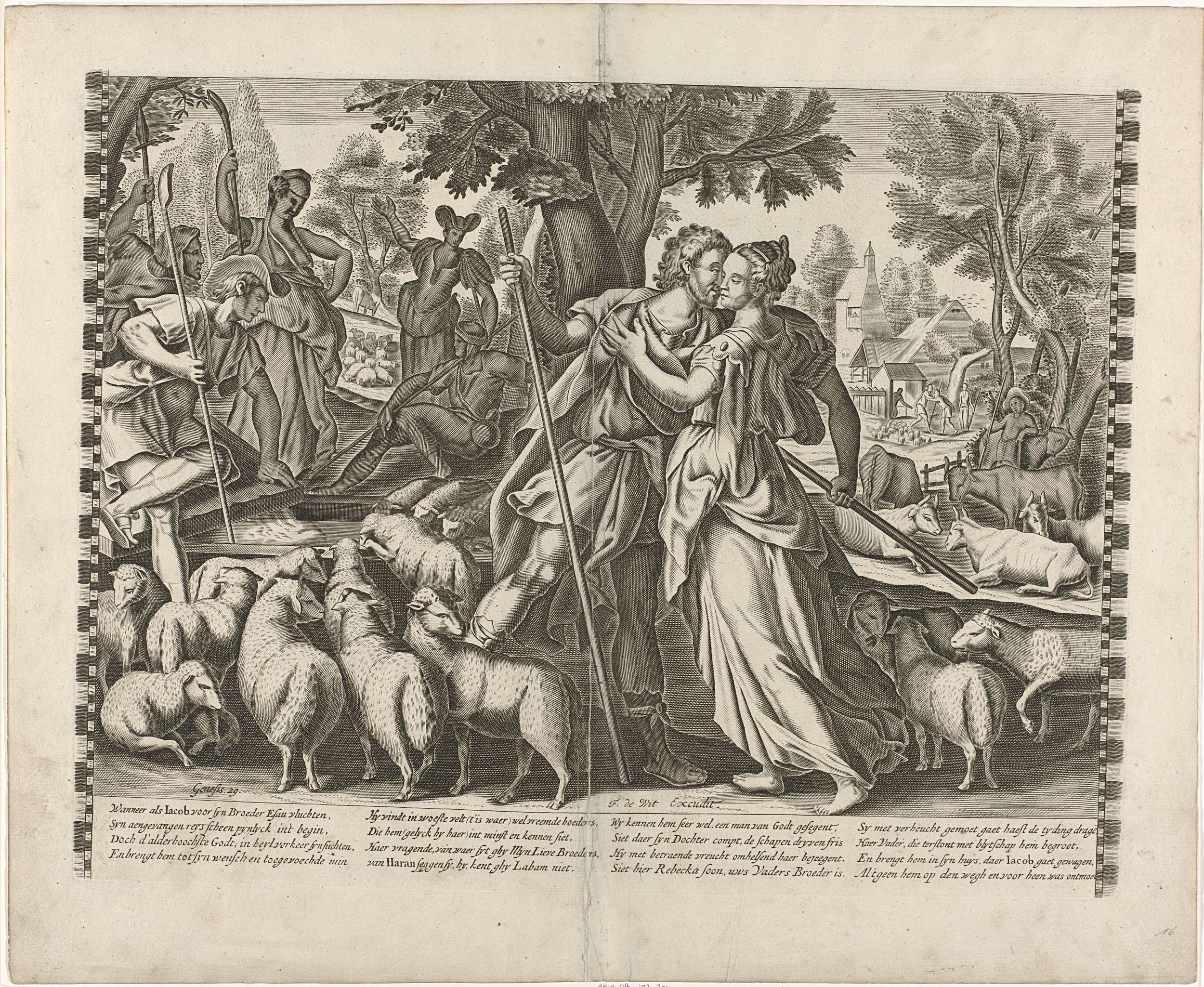 Bij de bron in Haran ontmoet Jakob Rachel, die haar vaders schapen te drinken geeft. Jakob omhelst Rachel. Daarnaast drinken de schapen bij de put, waarvan Jakob de deksteen heeft verwijderd. Links en rechts een pasrand. Onder de voorstelling vier vierregelige verzen in het Nederlands en een verwijzing naar de Bijbeltekst in Gen. 29.