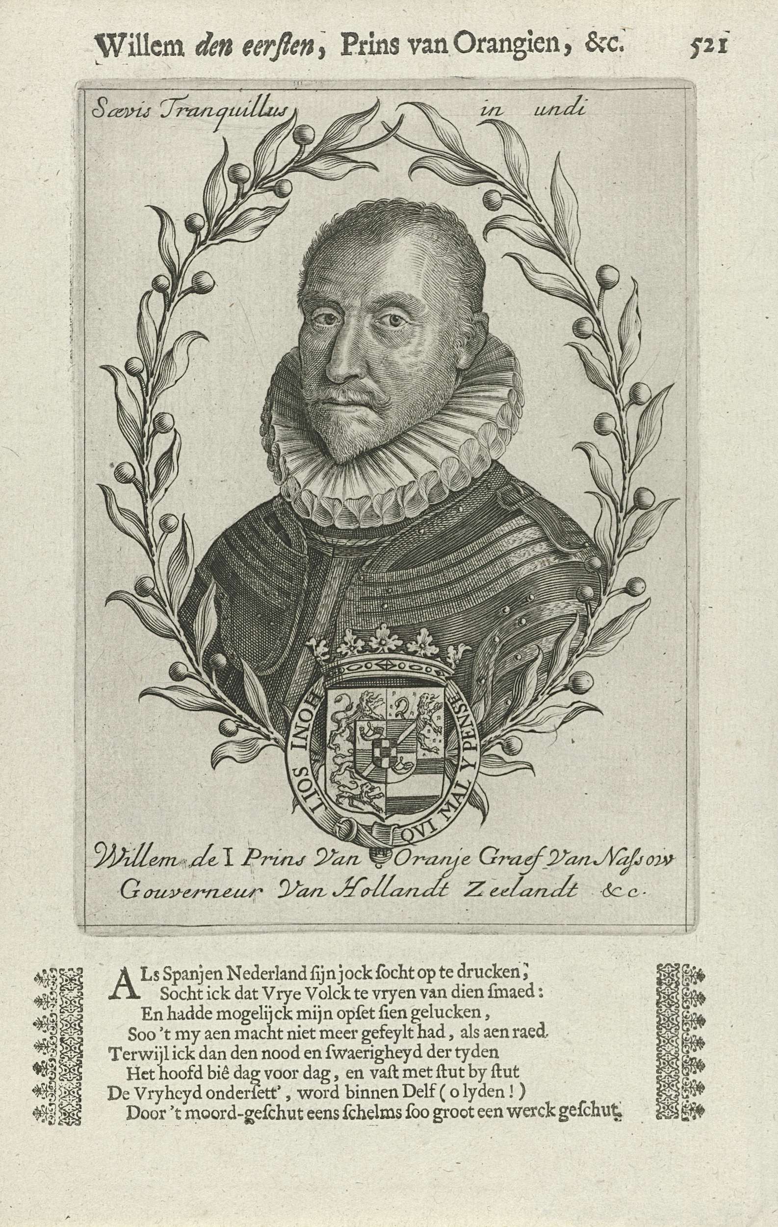 Portret van Willem I in een ovaal van oranjetakken. Midden onder zijn wapen met een kroon, gedecoreerd met de Kousenband en het devies van de Orde van de Kousenband. In de bovenmarge zijn lijfspreuk. In de ondermarge zijn naam.