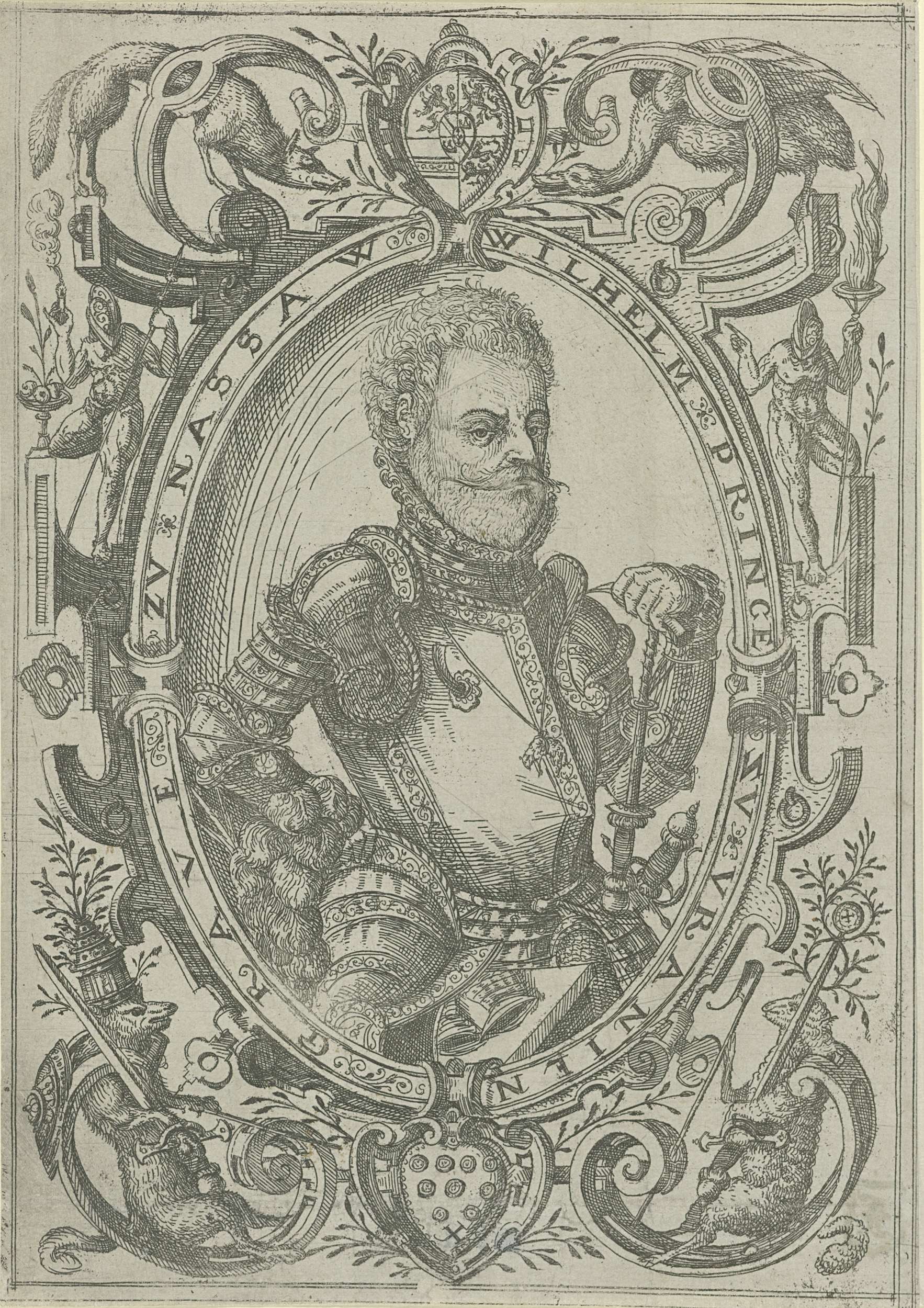Portret van Willem I in een ovaal met randschrift. Geheel in een omlijsting met arabesken en een aantal allegorische objecten. In de bovenhoeken de vos (Alva) tegenover de gans (Oranje), in de onderhoeken de wolf (Alva) tegenover het lam (Oranje) en de strijd om de Tiende Penning.