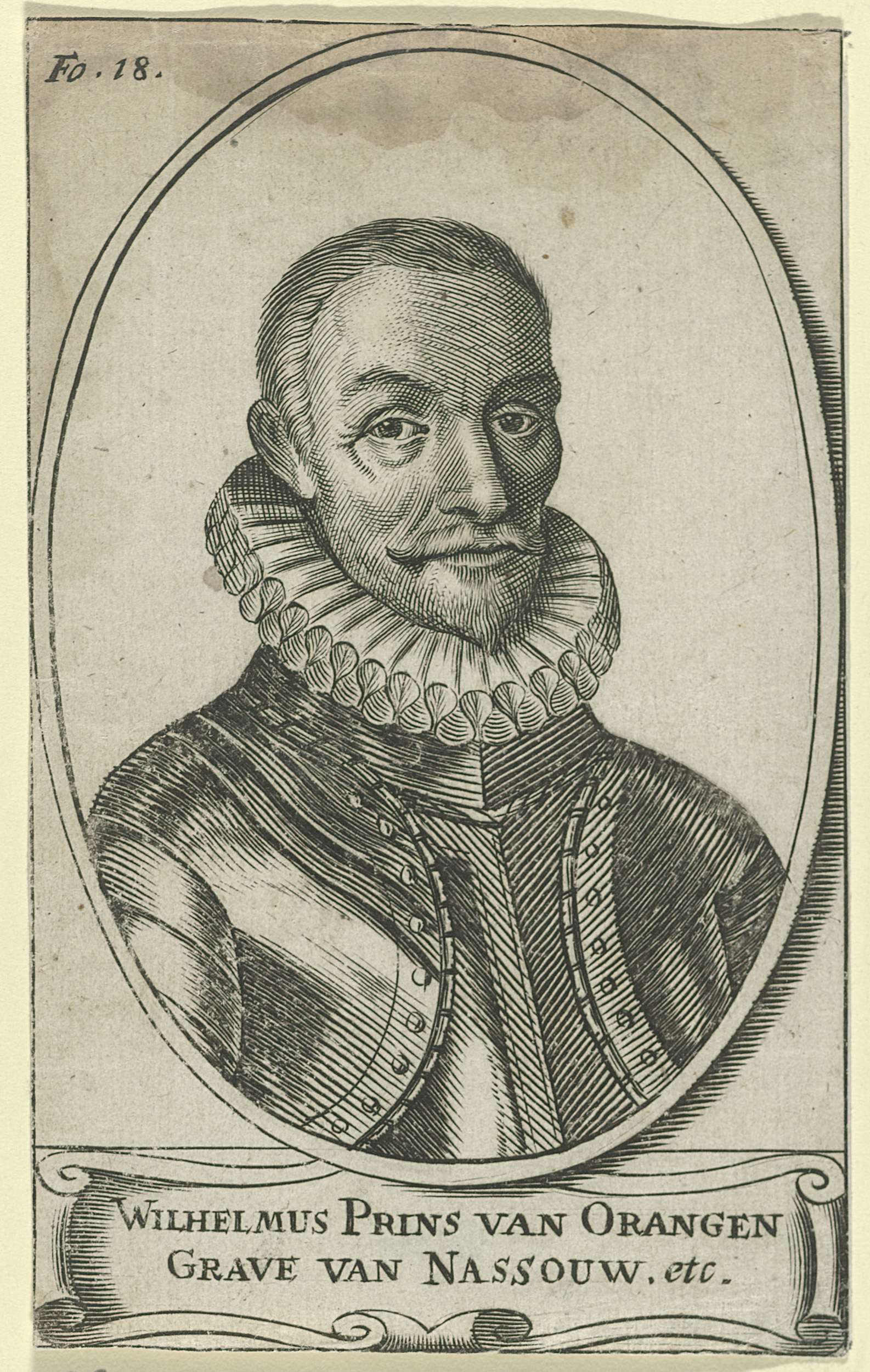 Portret van Willem I in een ovaal. In een cartouche zijn naam. Linksboven 'Fo. 18.'.