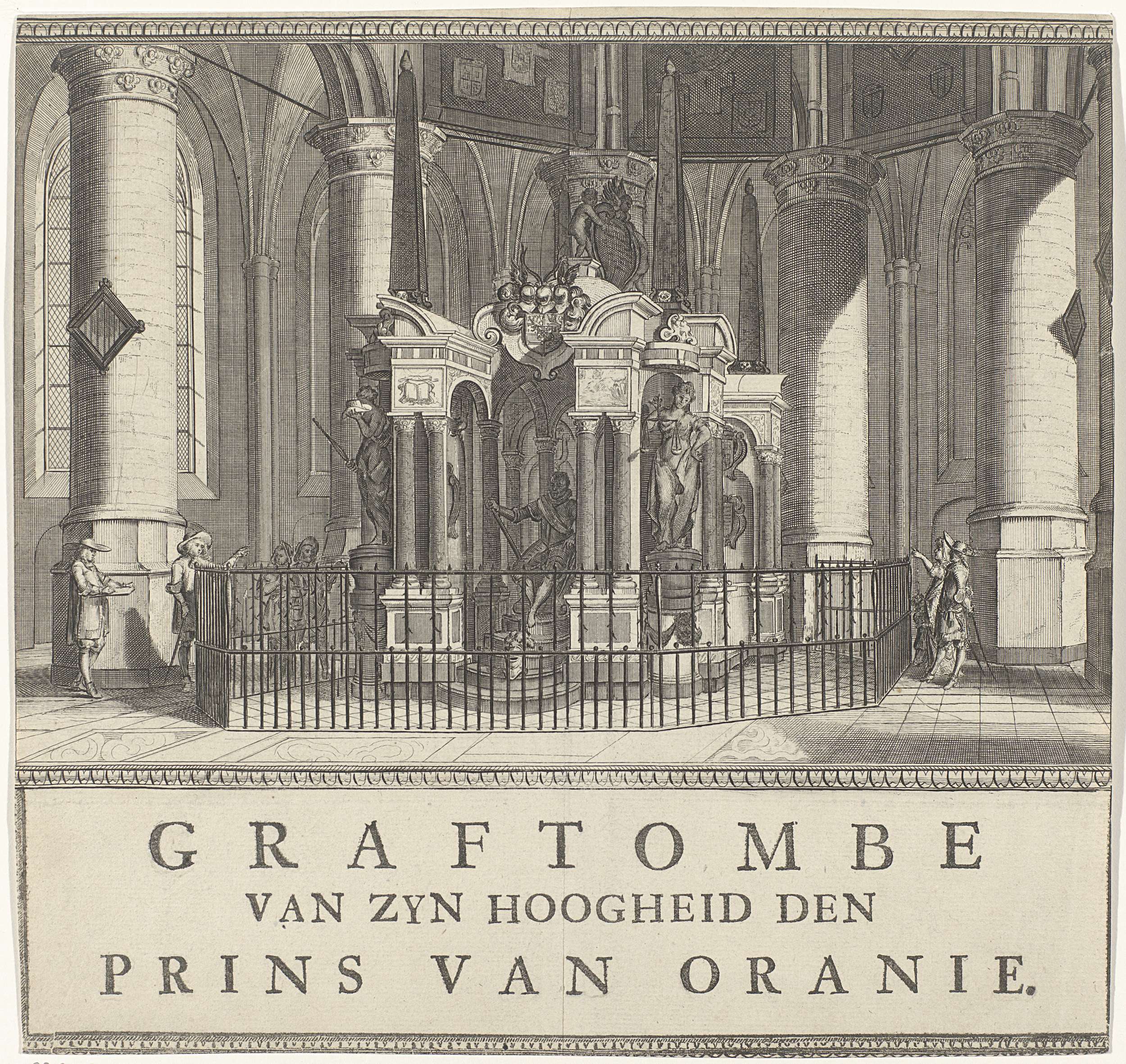 Graftombe of praalgraf van Willem I in de Nieuwe Kerk te Delft, voltooid in 1623. Gezien van voren met het beeld van de zittende prins. Met de omlijsting en met een apart gedrukte titel tegen de onderzijde van de voorstelling.