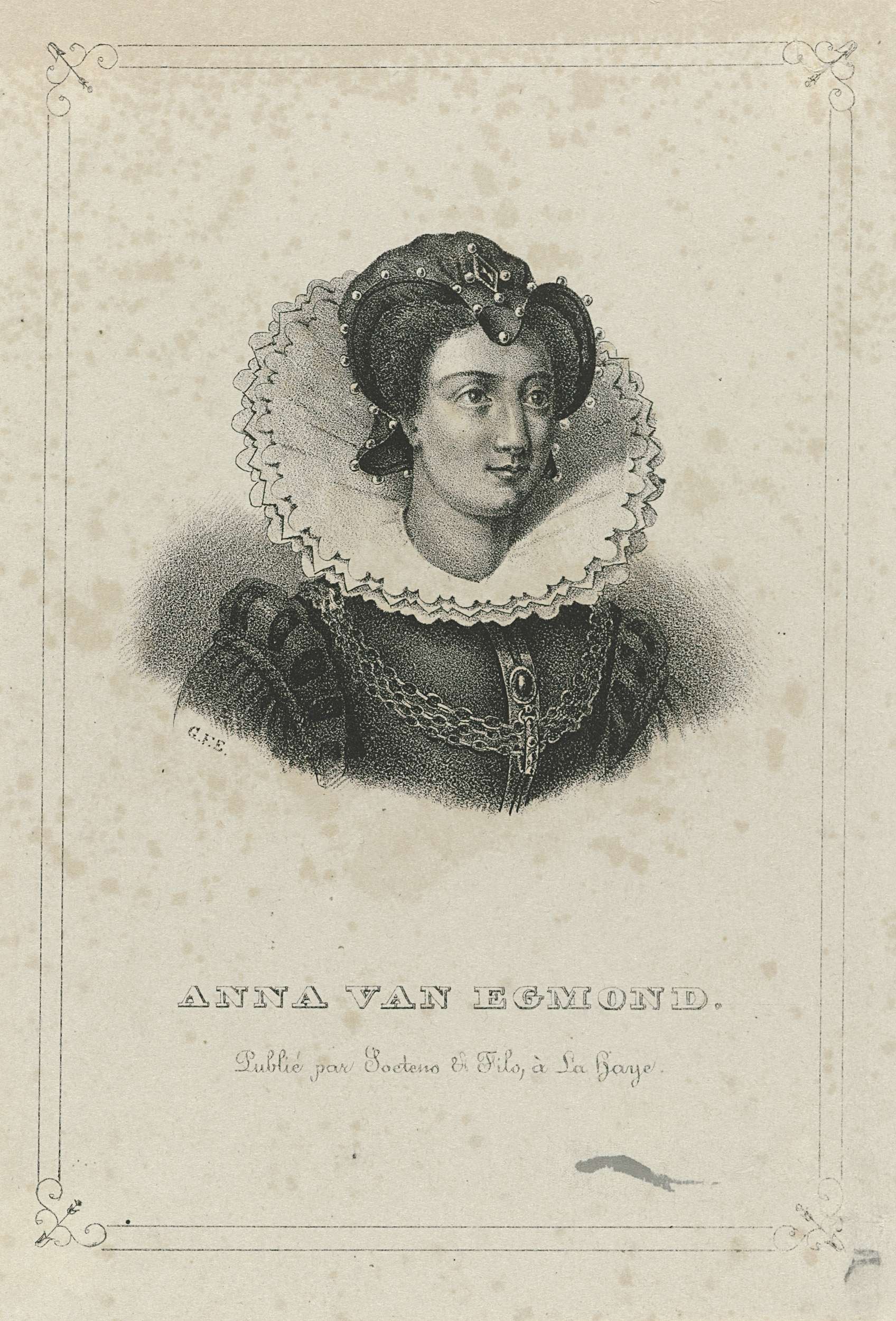 Portret van Anna in een geornamenteerde rechthoek. In de ondermarge haar naam.