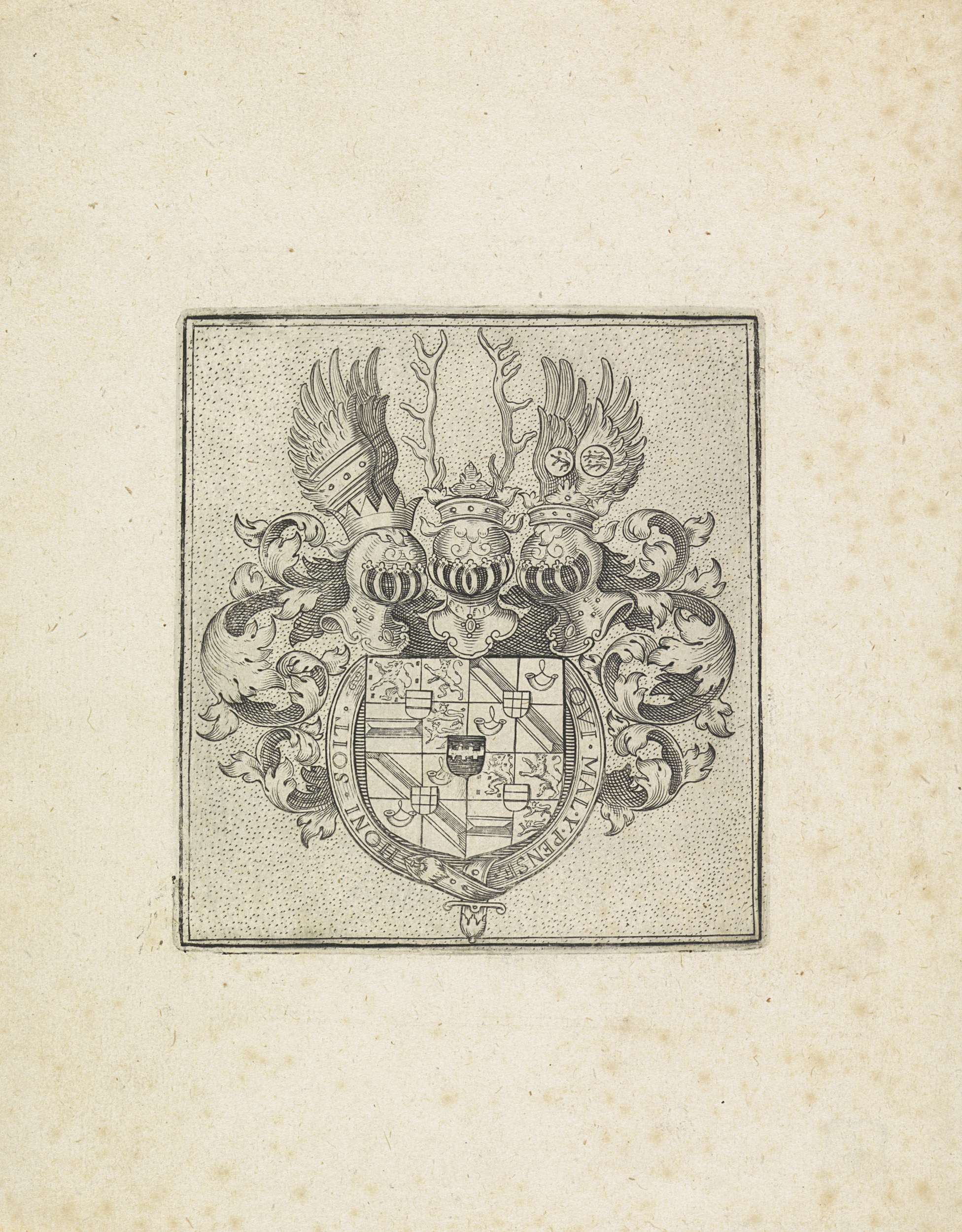 Wapen van Maurits gedecoreerd met de Kousenband en het devies van de Orde van de Kousenband.