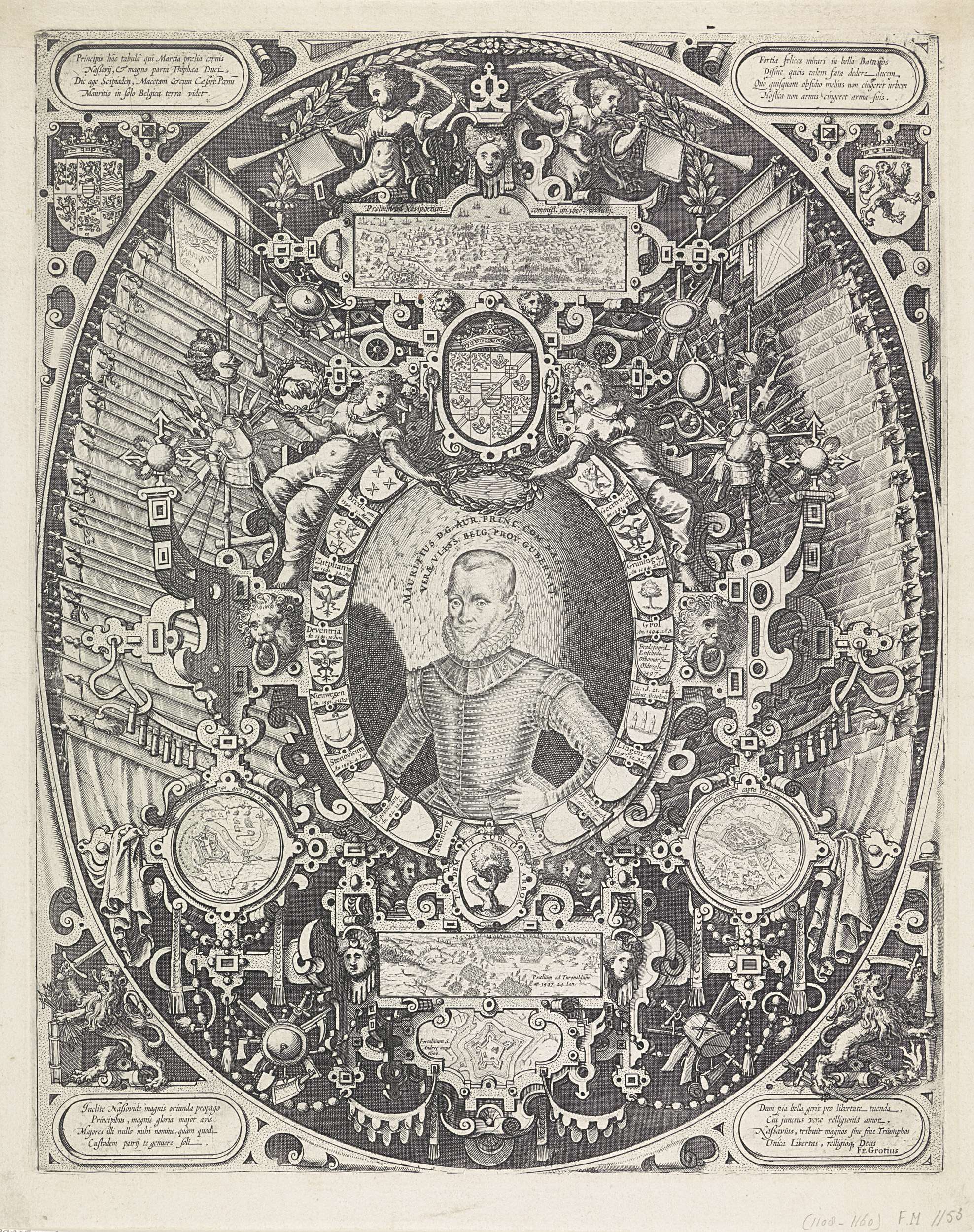 Portret van Maurits in een ovaal gevormd door wapens van veroverde plaatsen. Eendracht en Voorzichtigheid houden een lauwerkrans boven zijn hoofd. In vijf kleine scènes de veroveringen te Geertruidenberg (1593), Groningen (1594), Turnhout (1597), Sint-Andries (1600) en Nieuwpoort (1600). Verder rolwerk, wapentrofeeën en de buitgemaakte Spaanse vaandels. Onderaan links en rechts de Hollandse leeuw met ...