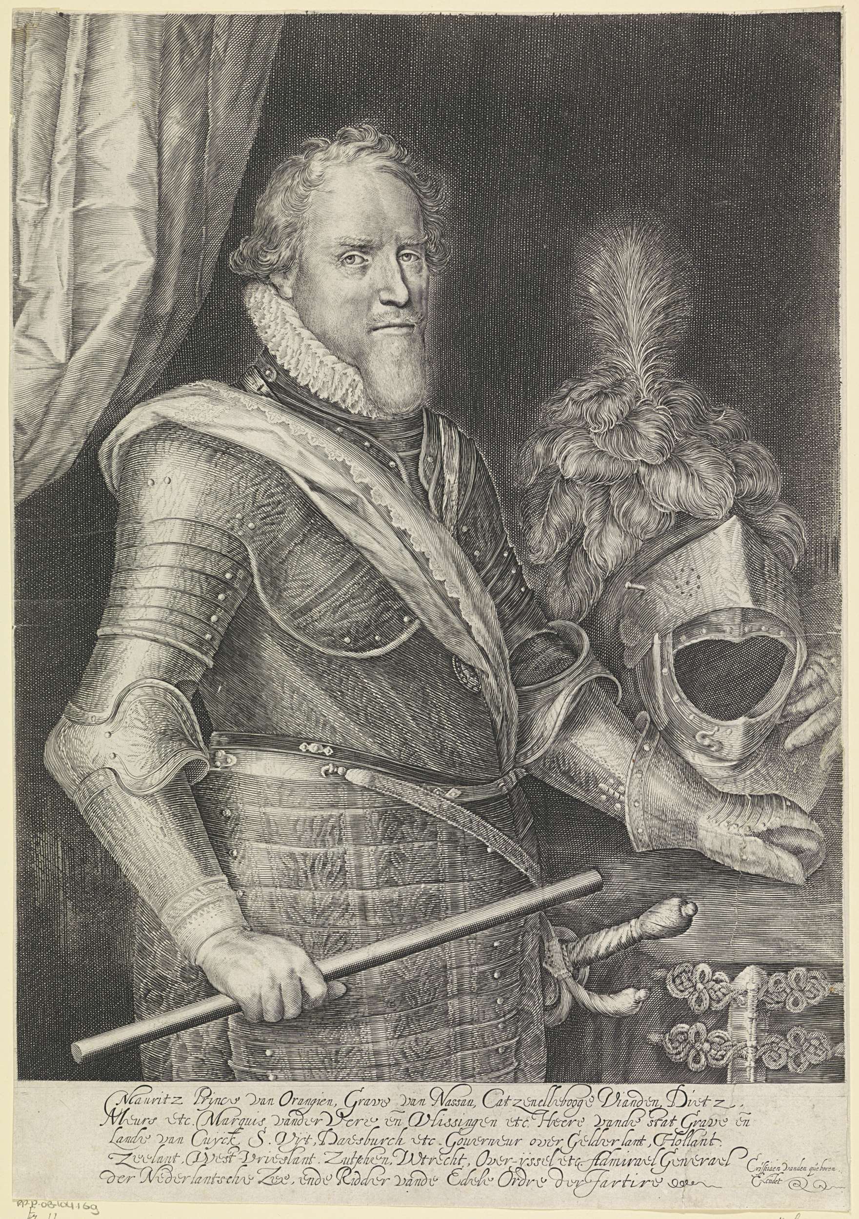 Portret van Maurits. Hij staat naast een tafel met daarop de helm van zijn harnas. Hij houdt een commandostaf in de hand. In de ondermarge vijf regels Nederlandse tekst.
