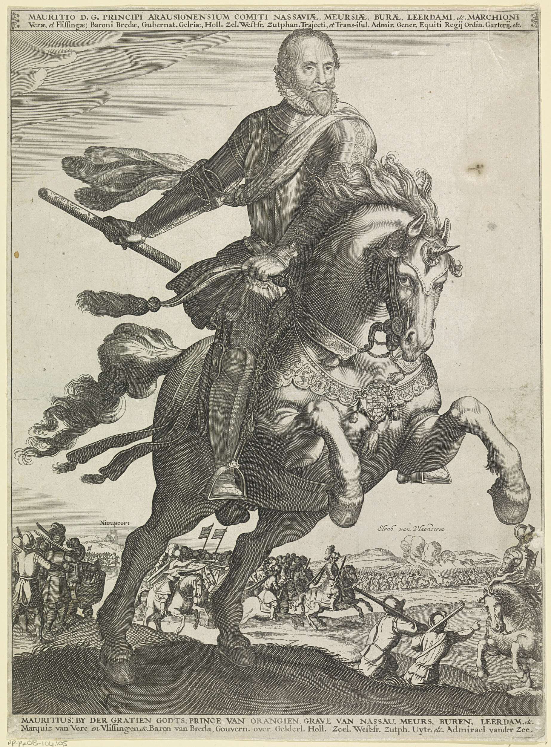 Ruiterportret van Maurits. Op de achtergrond de Slag bij Nieuwpoort, 2 juli 1600. In de bovenmarge twee regels Latijnse tekst. In de ondermarge twee regels Nederlandse tekst.