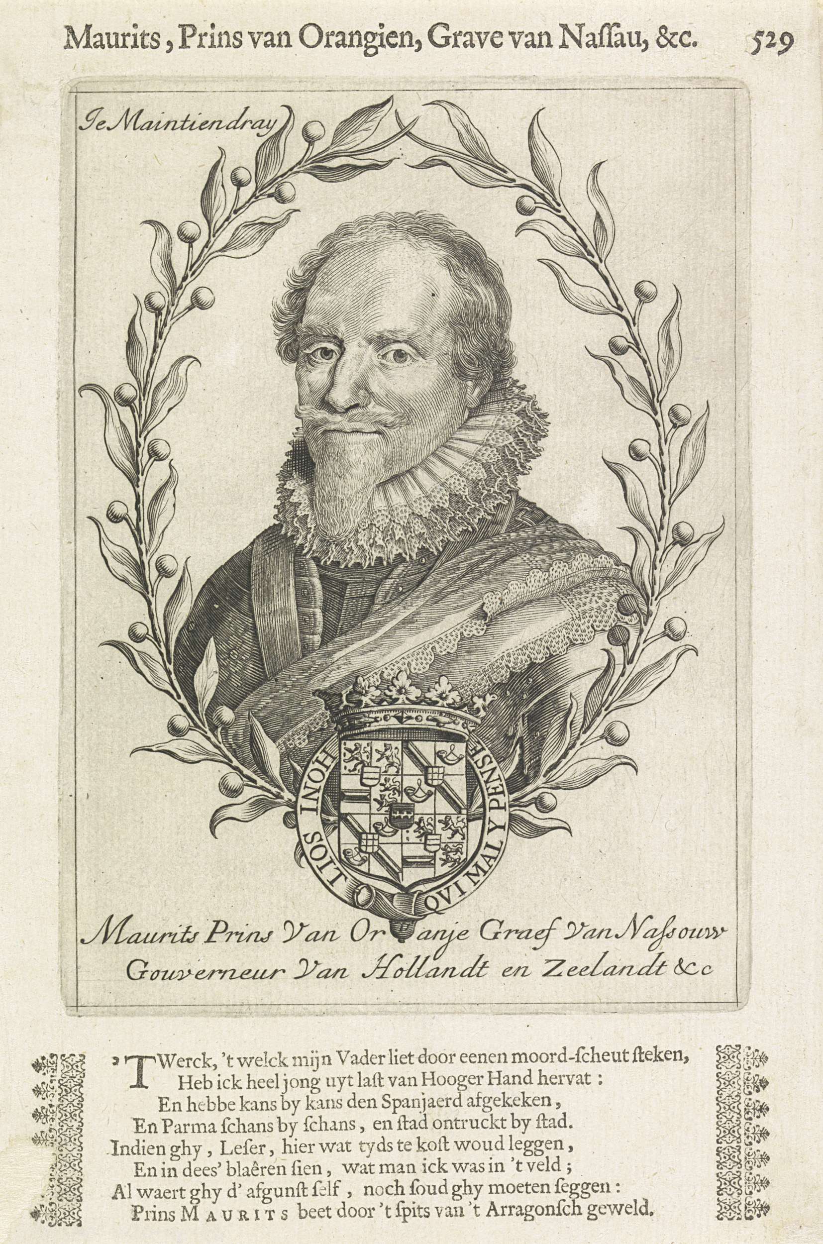Portret van Maurits in een ovaal van oranjetakken. Midden onder zijn wapen met een kroon, gedecoreerd met de Kousenband en het devies van de Orde van de Kousenband. Linksboven zijn geslachtsspreuk. In de ondermarge zijn naam.