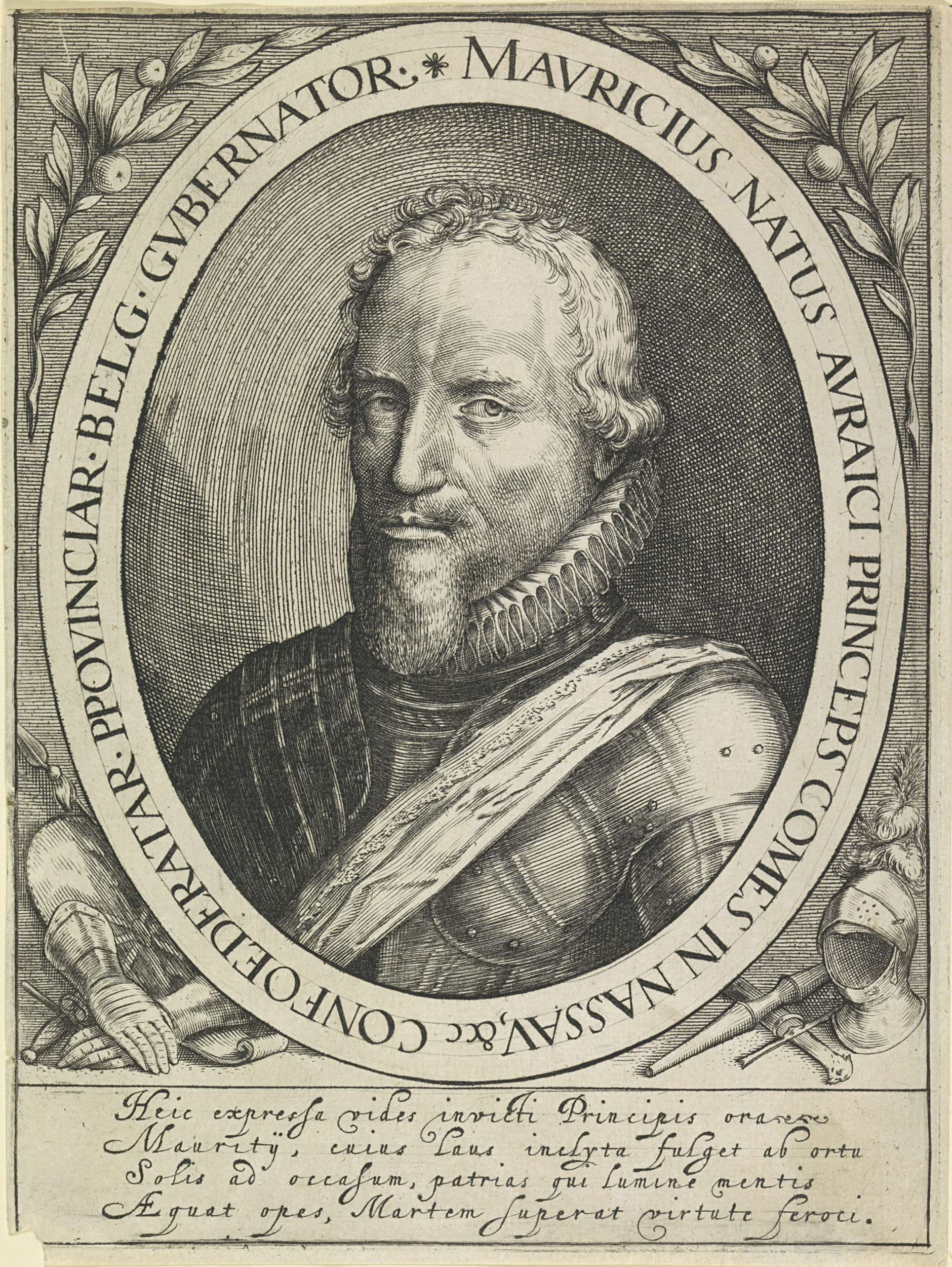 Portret van Maurits in een ovaal met randschrift. Daar omheen oranjetakken en een aantal allegorische objecten. In de ondermarge vier regels Latijnse tekst.