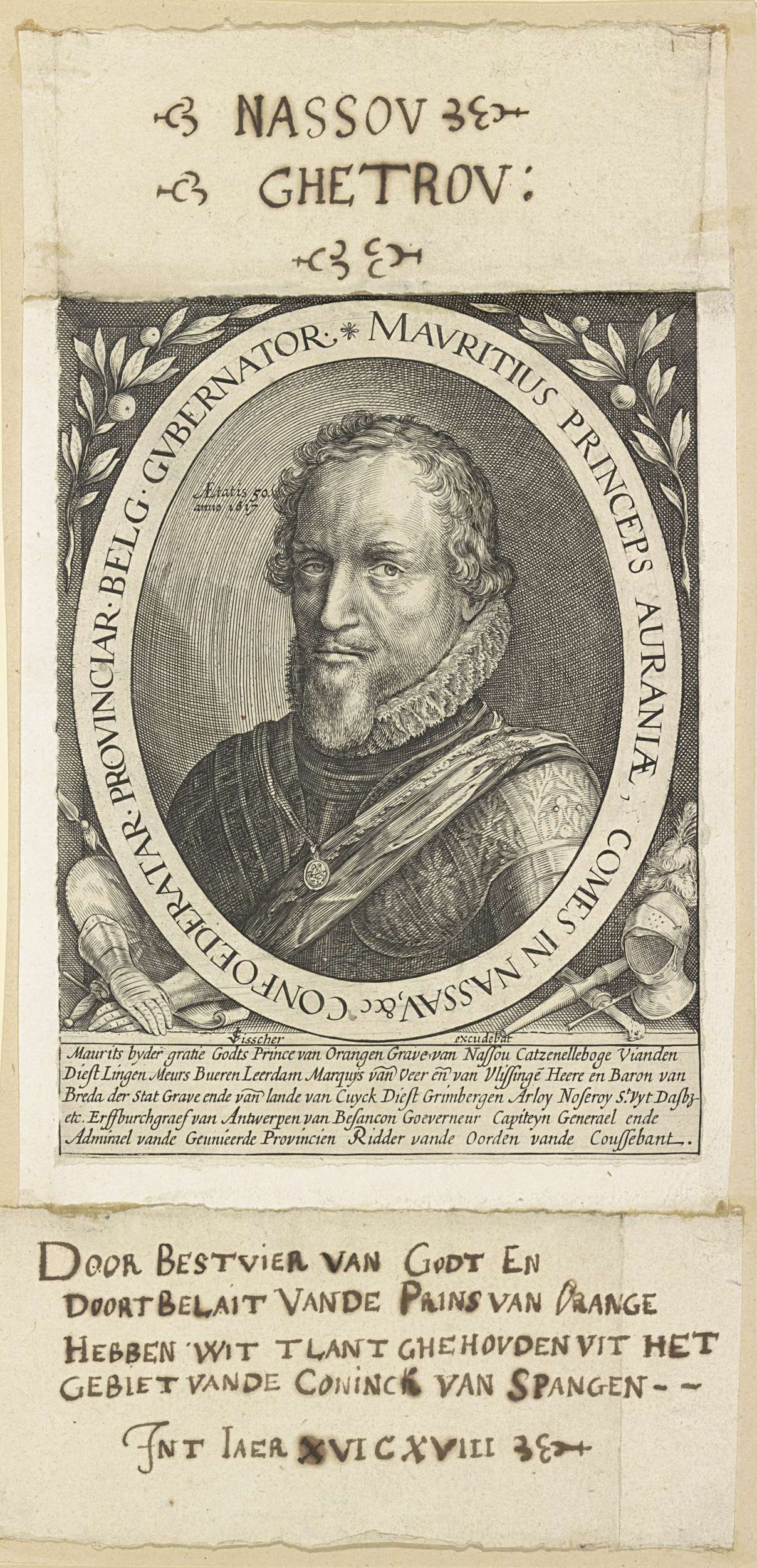 Portret van Maurits in een ovaal met randschrift. Daar omheen oranjetakken en een aantal allegorische objecten. In de ondermarge vijf regels Nederlandse tekst.