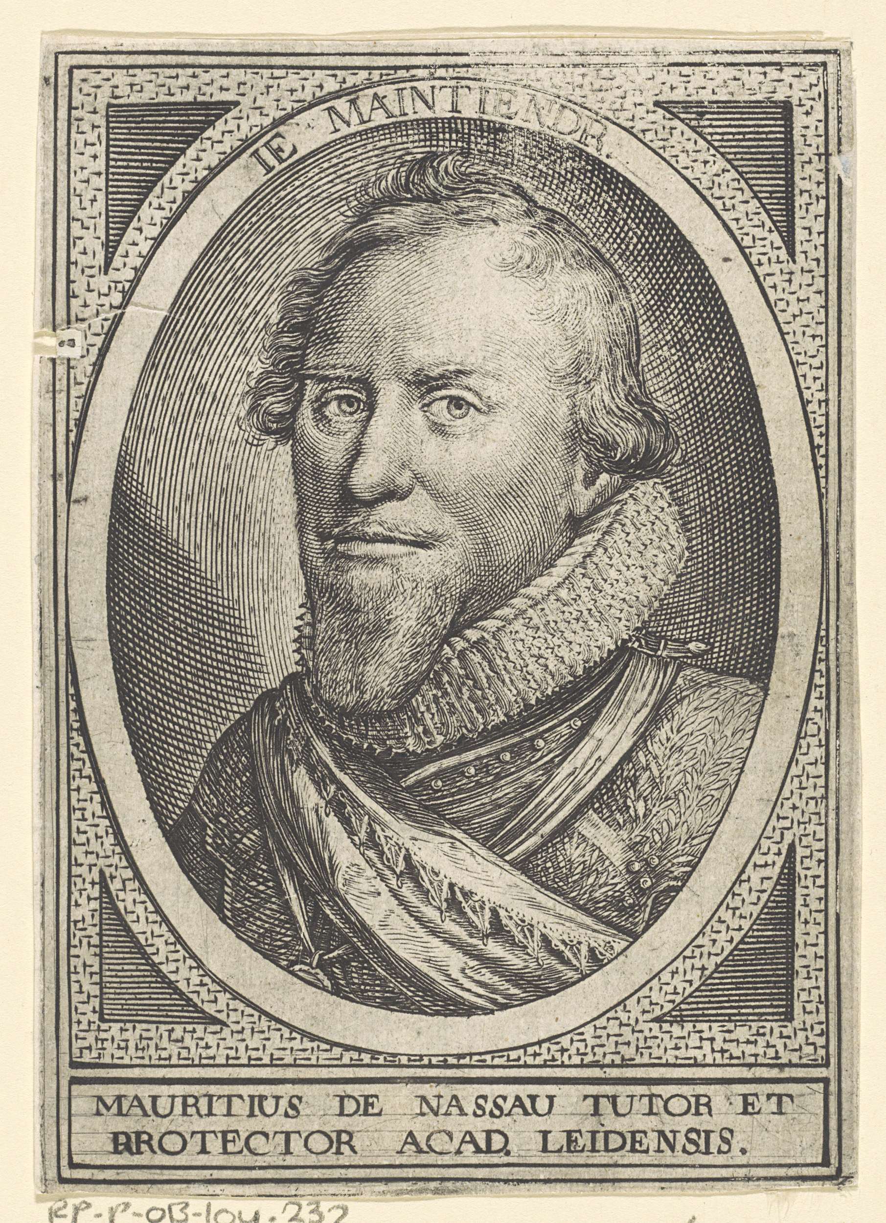 Portret van Maurits in een ovaal. In een kader twee regels Latijnse tekst.