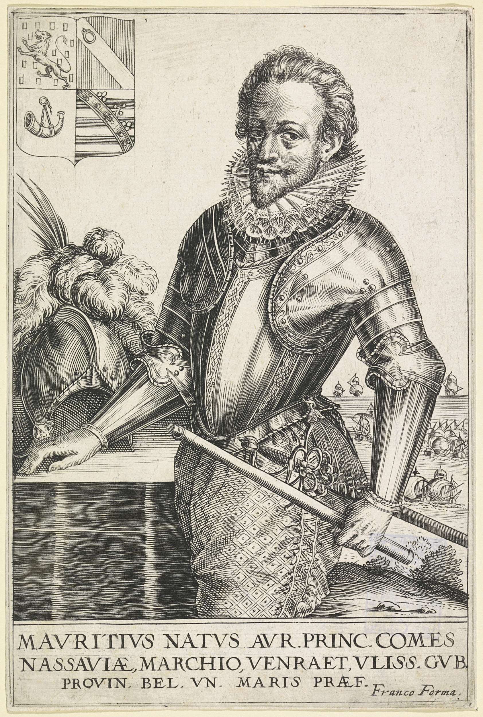 Portret van Maurits met links zijn wapen. Hij staat naast een tafel met daarop de helm van zijn harnas. Hij houdt een commandostaf in de hand. Op de achtergrond een zeeslag. In een kader zijn naam.