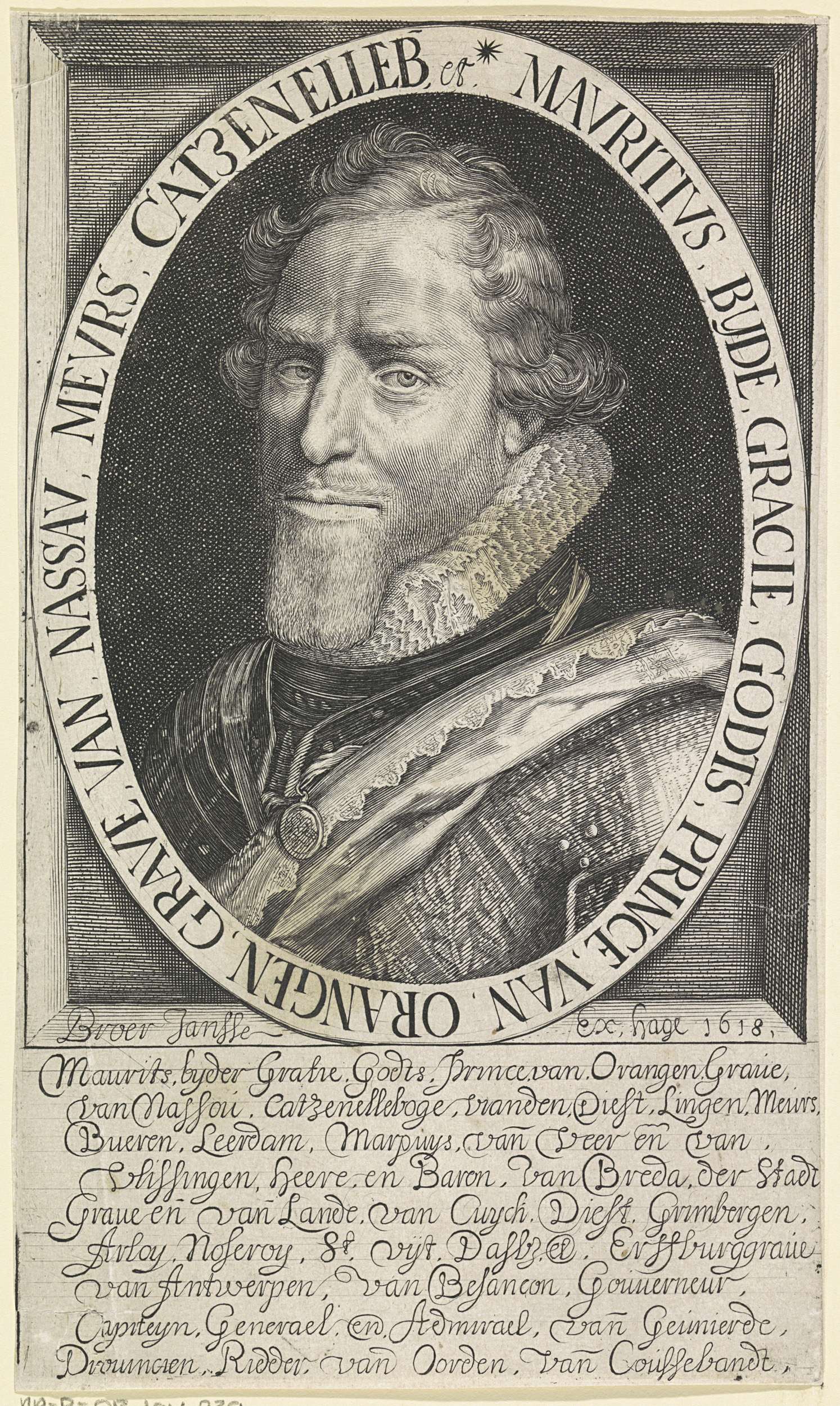 Portret van Maurits in een ovaal met randschrift. In de ondermarge negen regels Nederlandse tekst.