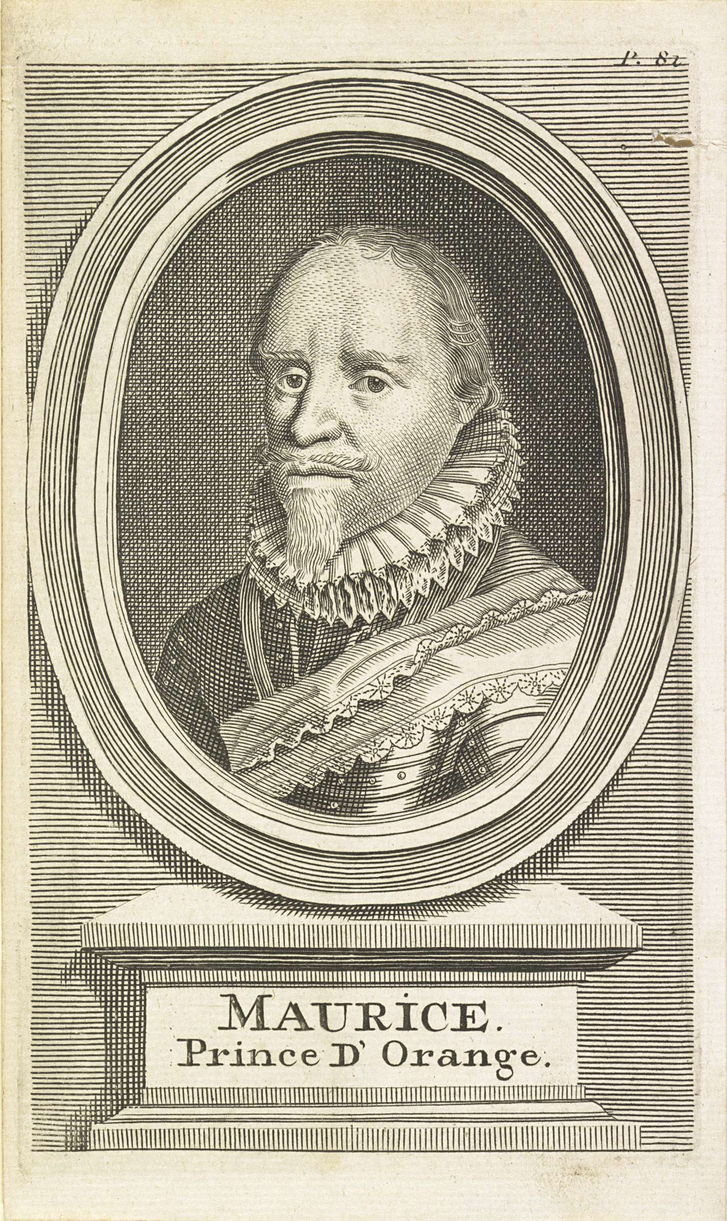 Portret van Maurits in een ovaal. Op een voetstuk zijn naam. Rechtsboven 'P. 82'.