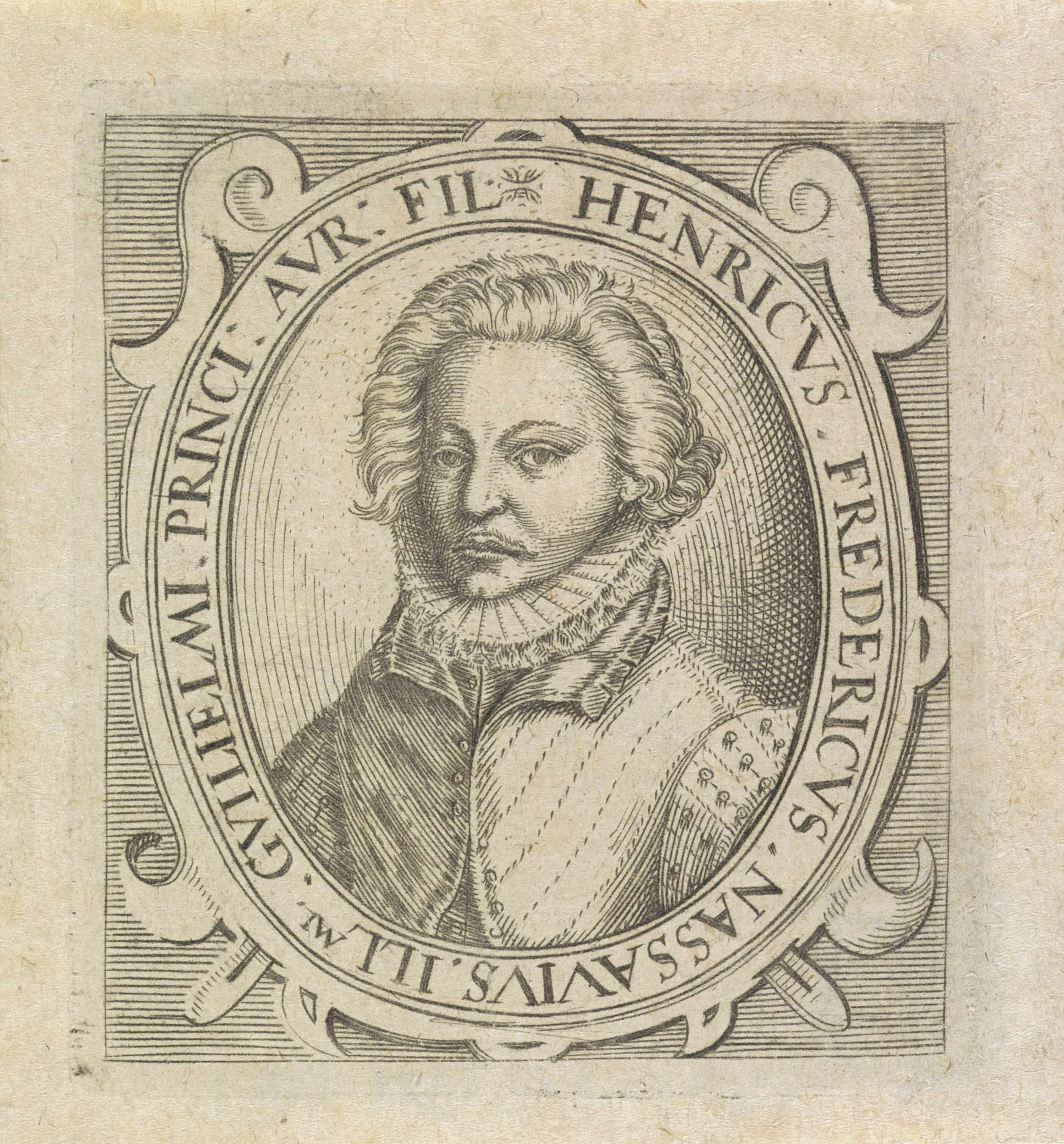 Portret van Frederik Hendrik in een geornamenteerd ovaal met randschrift.