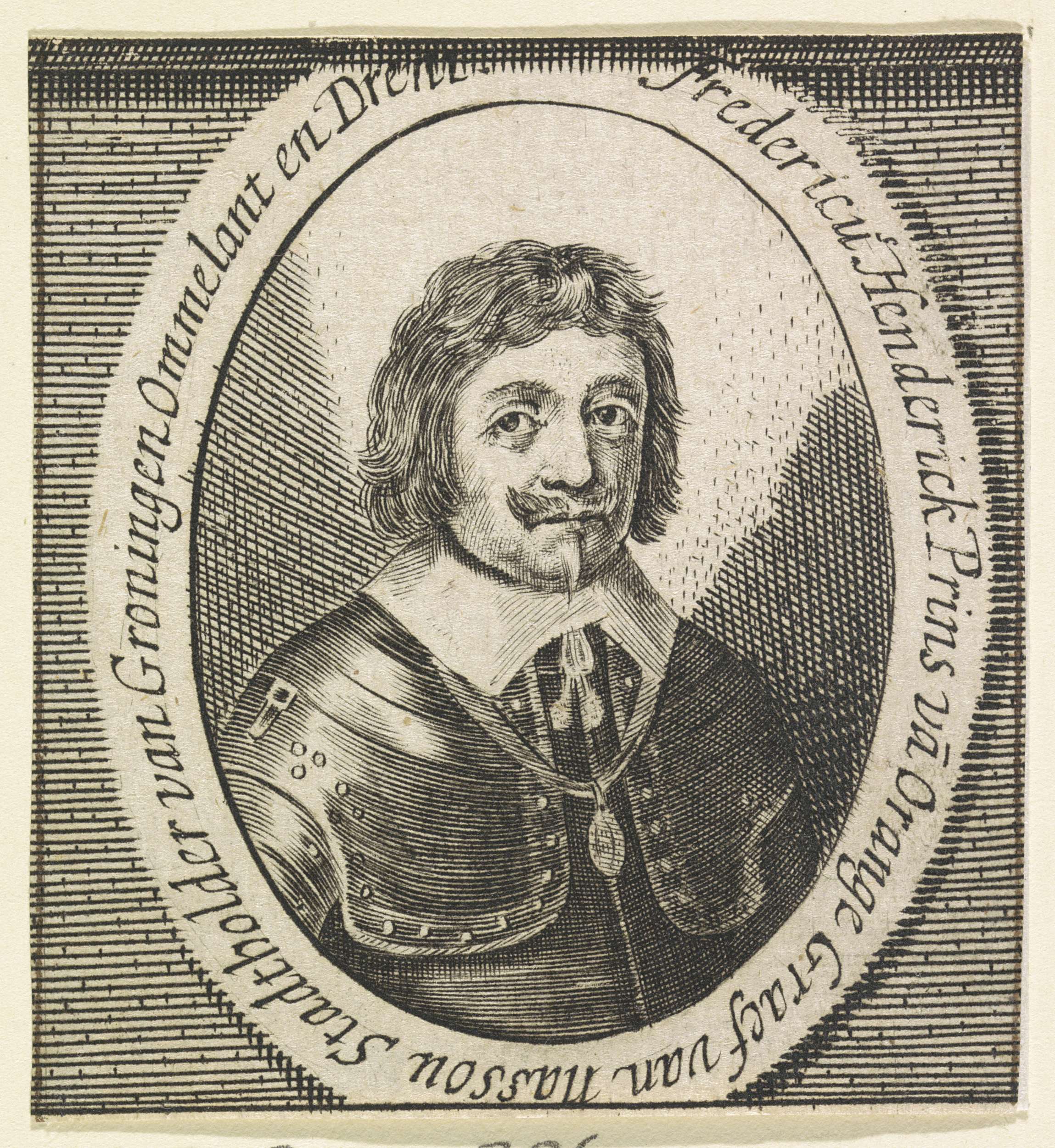 Portret van Frederik Hendrik in een ovaal met randschrift.