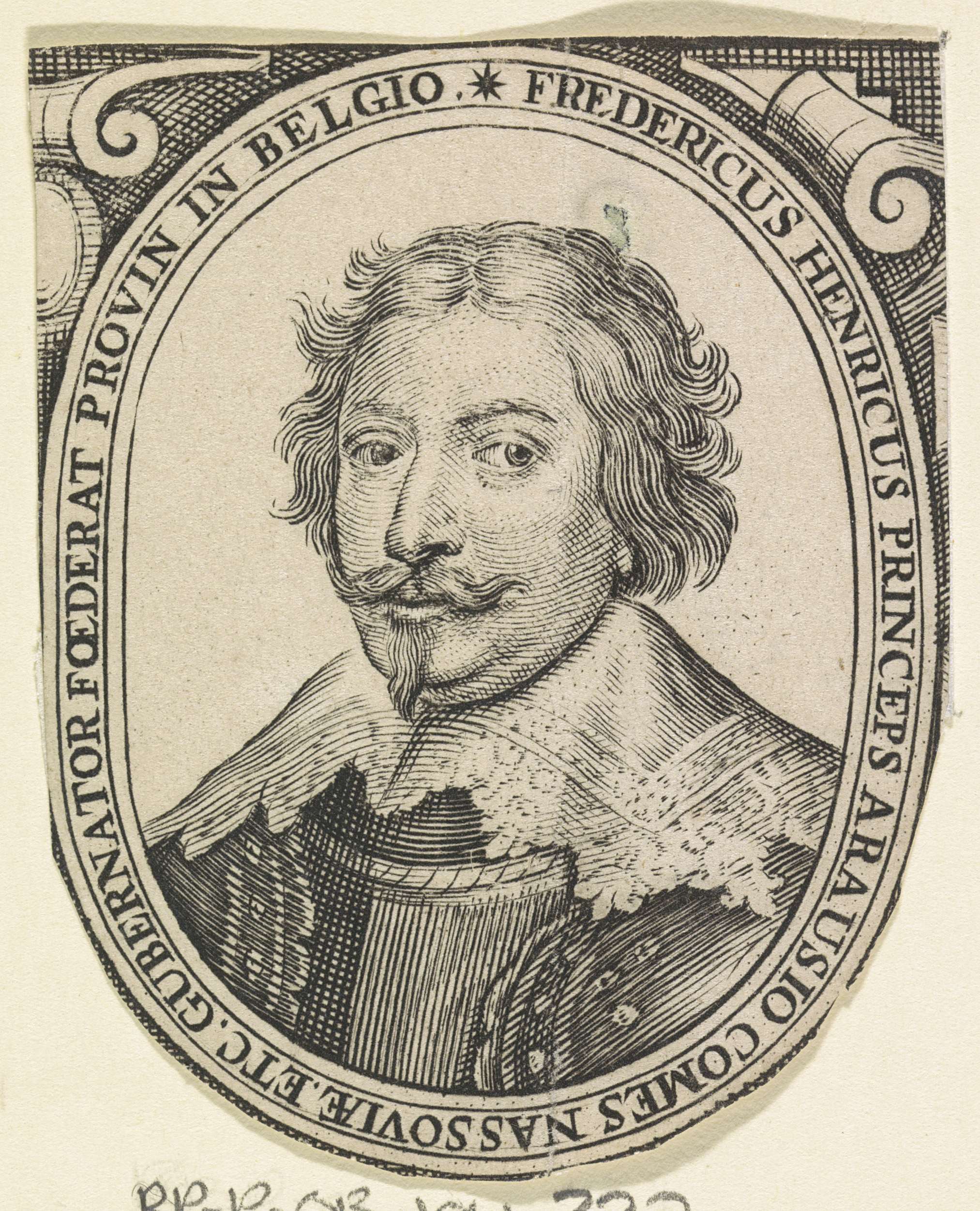 Portret van Frederik Hendrik in een ovaal met randschrift. Links- en rechtsboven ornamenten.