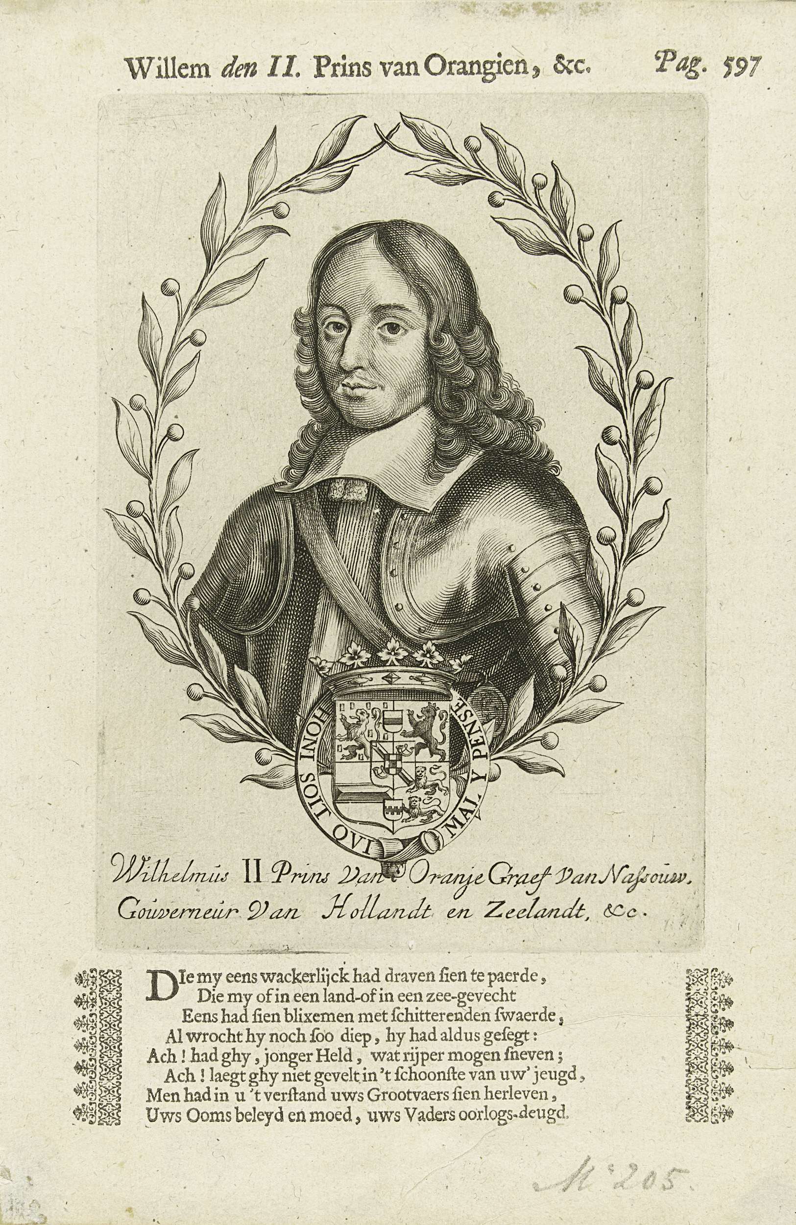 Portret van Willem II in een ovaal van oranjetakken. Midden onder zijn wapen met een kroon, gedecoreerd met de Kousenband en het devies van de Orde van de Kousenband. In de ondermarge zijn naam.