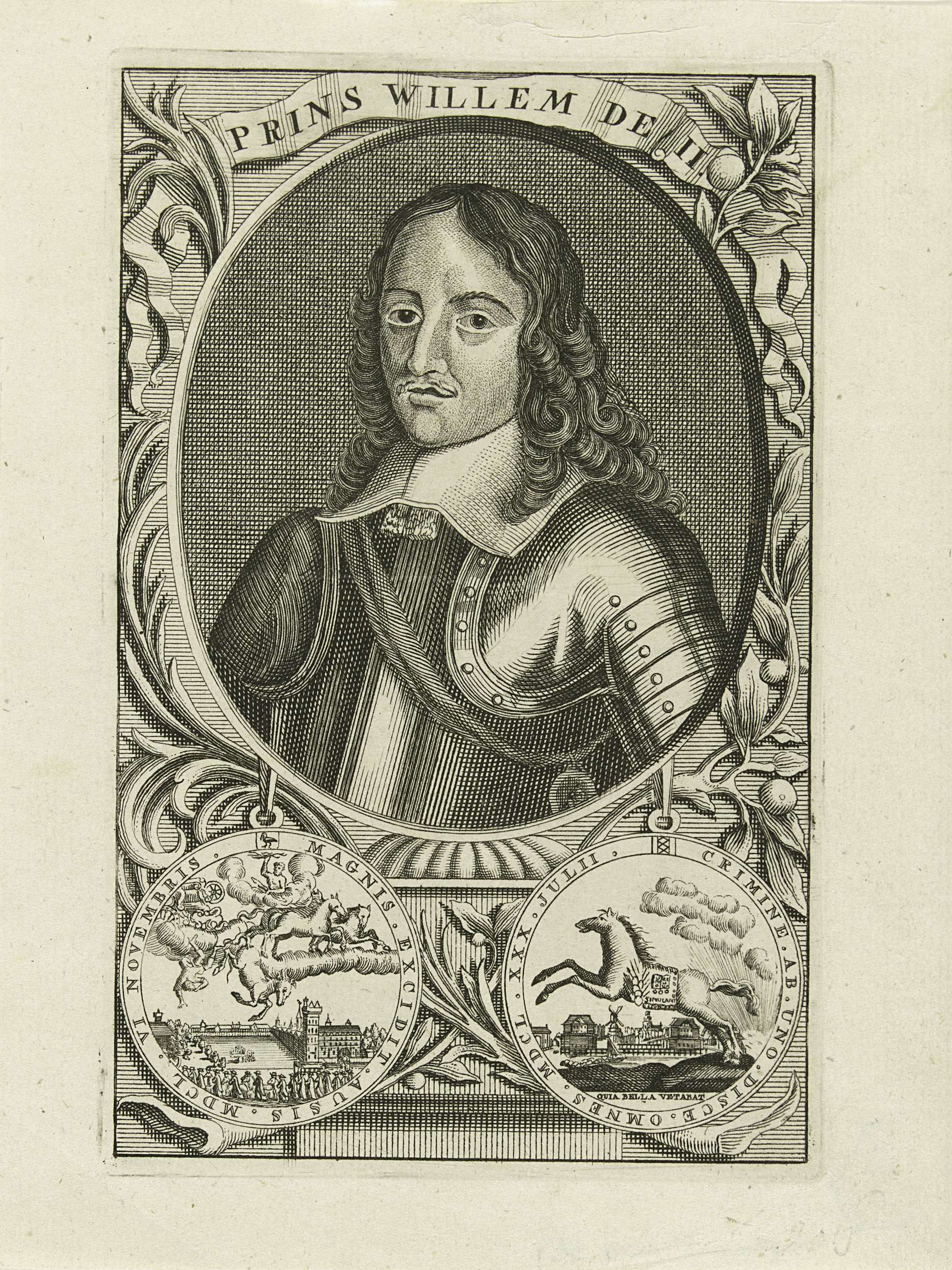 Portret van Willem II in een ovaal. Links- en rechtsonder twee kanten van een medaille. Op een banderol zijn naam.