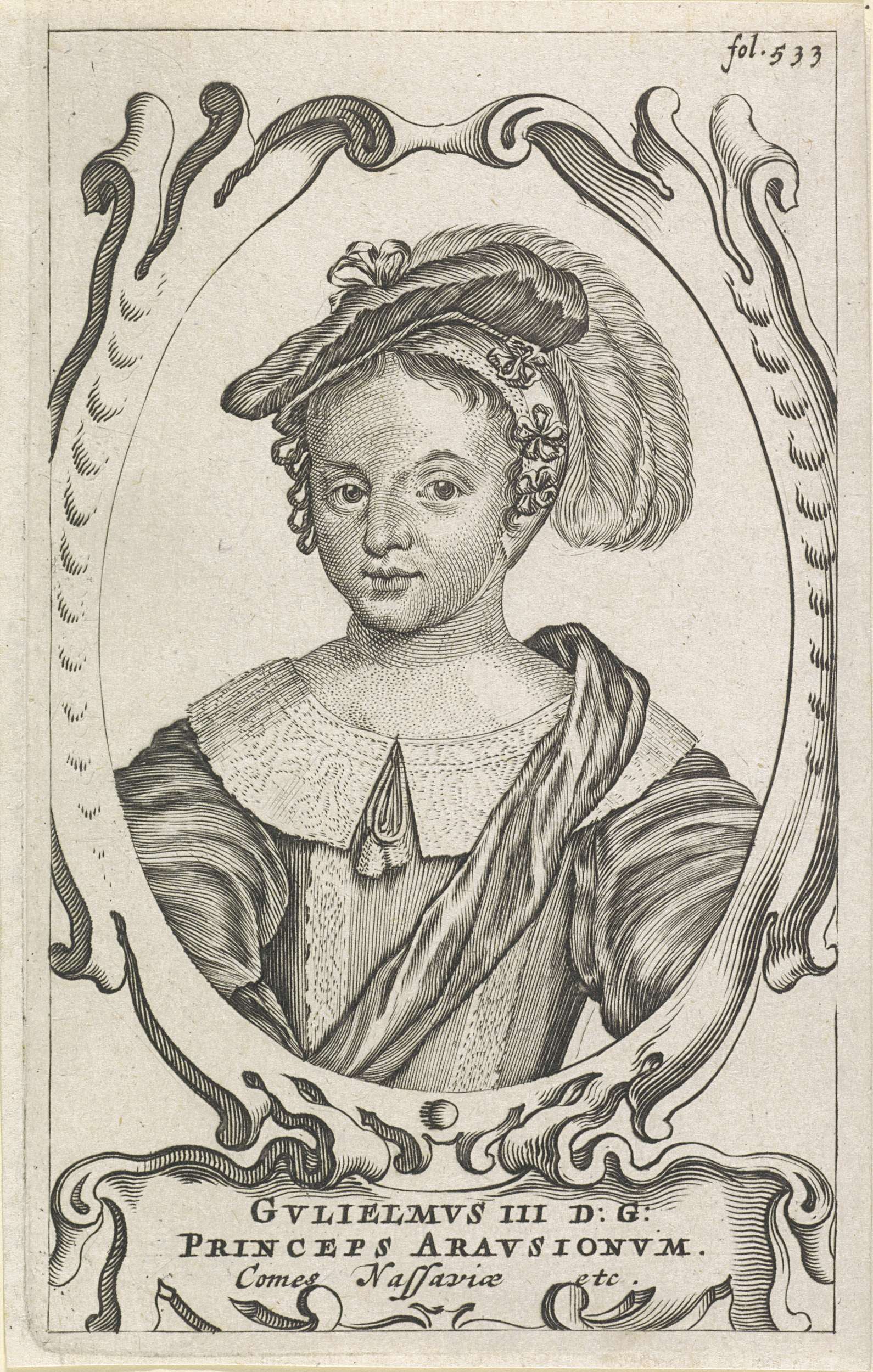 Portret van Willem III in een geornamenteerd ovaal. In een cartouche zijn naam. Rechtsboven 'fol. 533'.