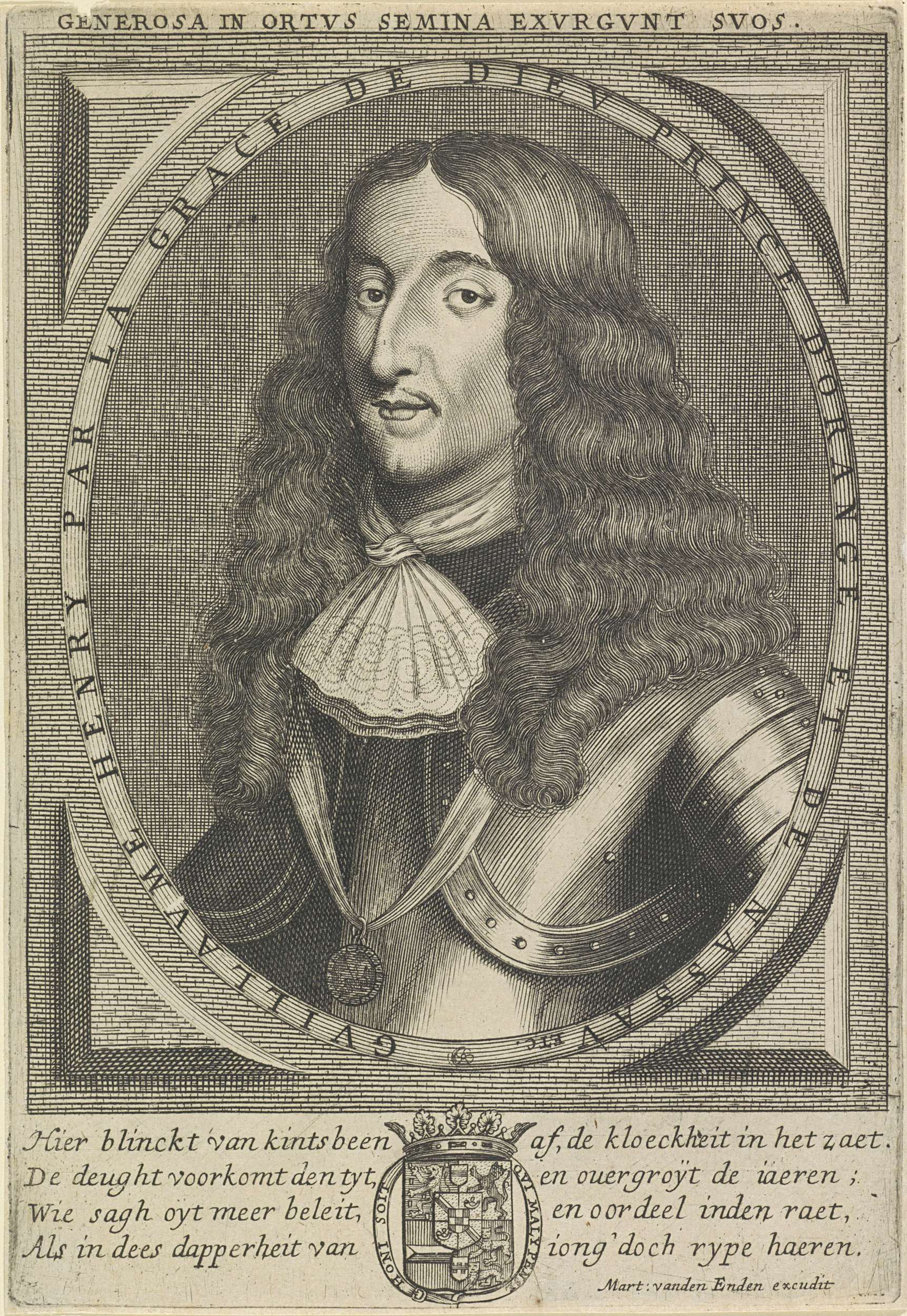 Portret van Willem III in een ovaal met randschrift in het Frans. Midden onder zijn wapen met een kroon, gedecoreerd met de Kousenband en het devies van de Orde van de Kousenband. In de bovenmarge een regel Latijnse tekst. In de ondermarge vier regels Nederlandse tekst.