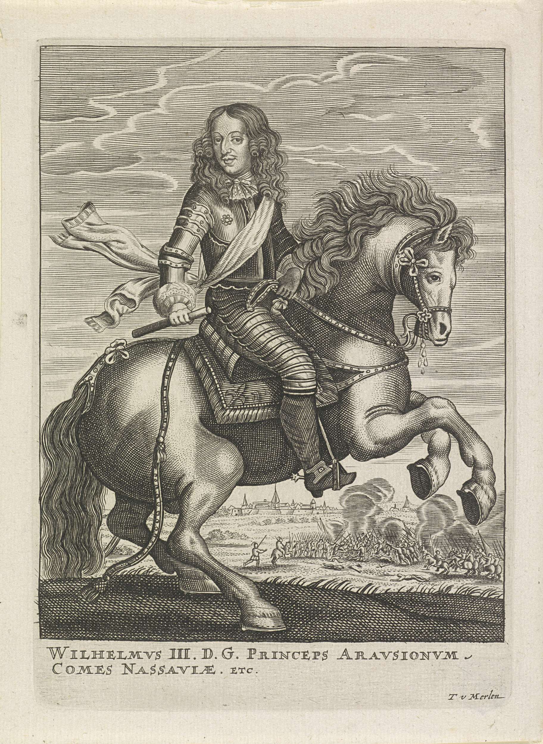 Ruiterportret van Willem III. Op de achtergrond een veldslag. In de ondermarge zijn naam en titels.