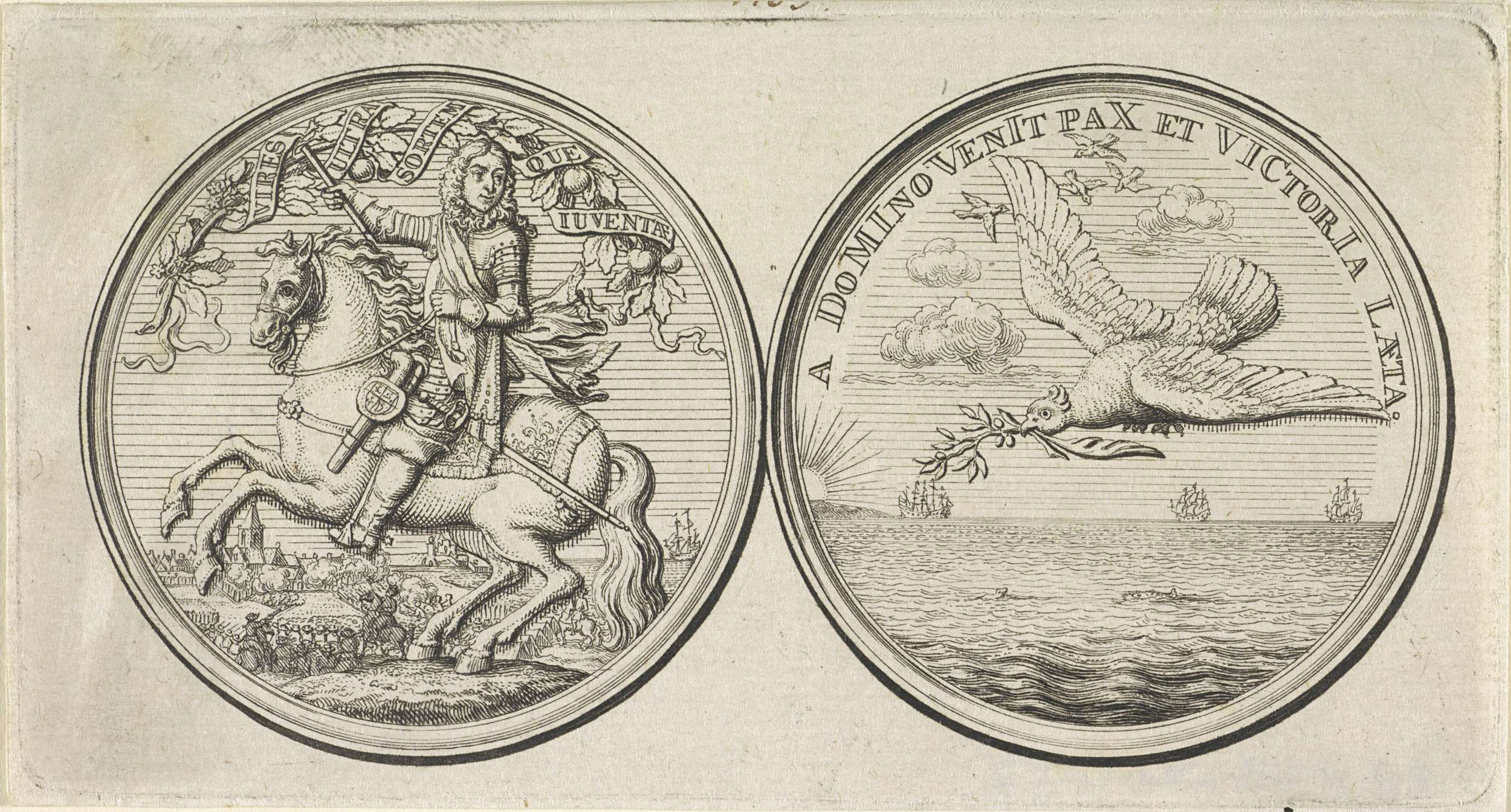 Ruiterportret van Willem III in een cirkel links. Een vogel met een oranjetak in een cirkel met randschrift rechts.