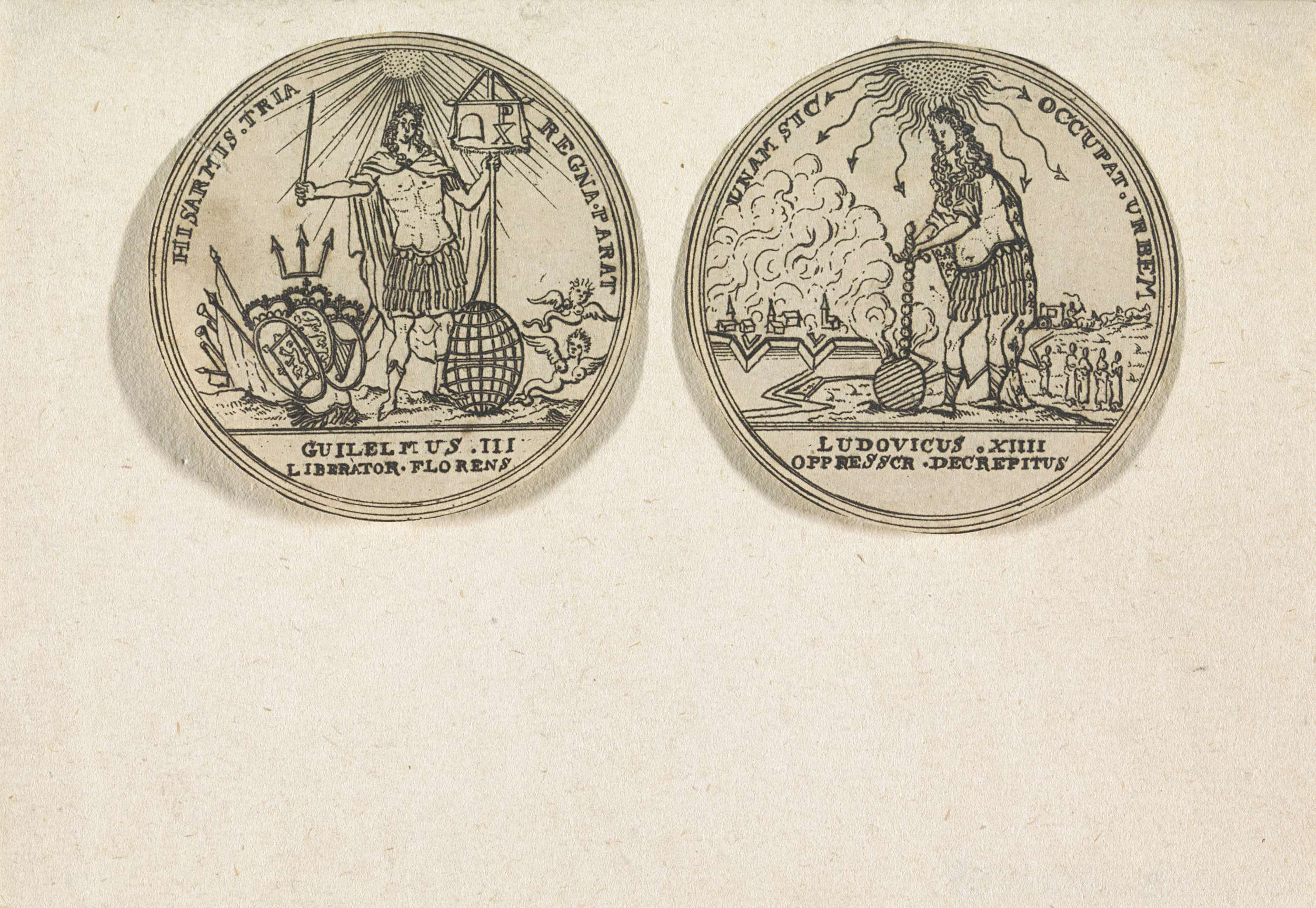 Portret van Willem III met een aantal allegorische objecten in een cirkel met randschrift links. Lodewijk XIV met een aantal allegorische objecten in een cirkel met randschrift rechts.
