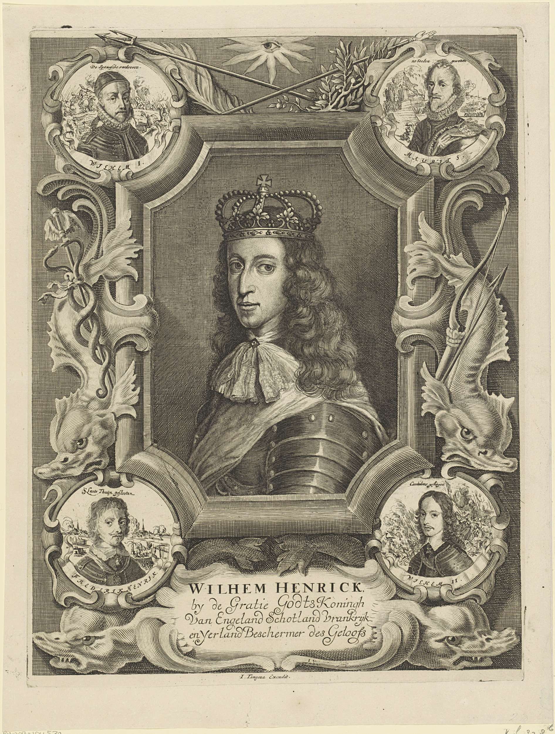 Portret van Willem III met een kroon in een achtkantige omlijsting. In de vier hoeken portretten van de vier voorgaande stadhouders Willem I, Maurits, Frederik Hendrik en Willem II. In een cartouche zijn naam en drie regels Nederlandse tekst. Geheel in een omlijsting met arabesken en een aantal allegorische objecten en dieren.