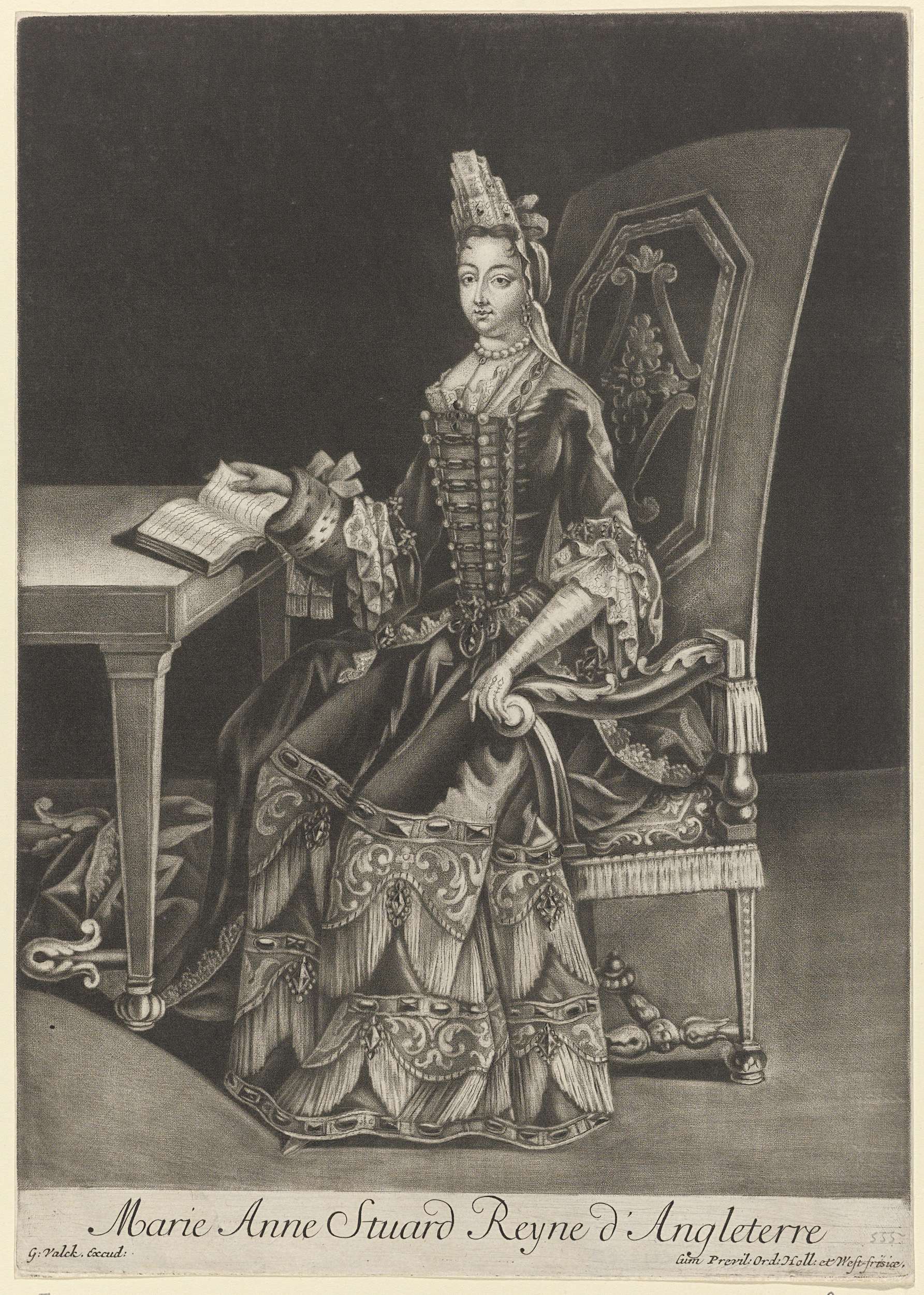 Portret van Maria II. Ze zit aan een tafel met een opengeslagen boek. In de ondermarge haar naam en titel in het Frans.