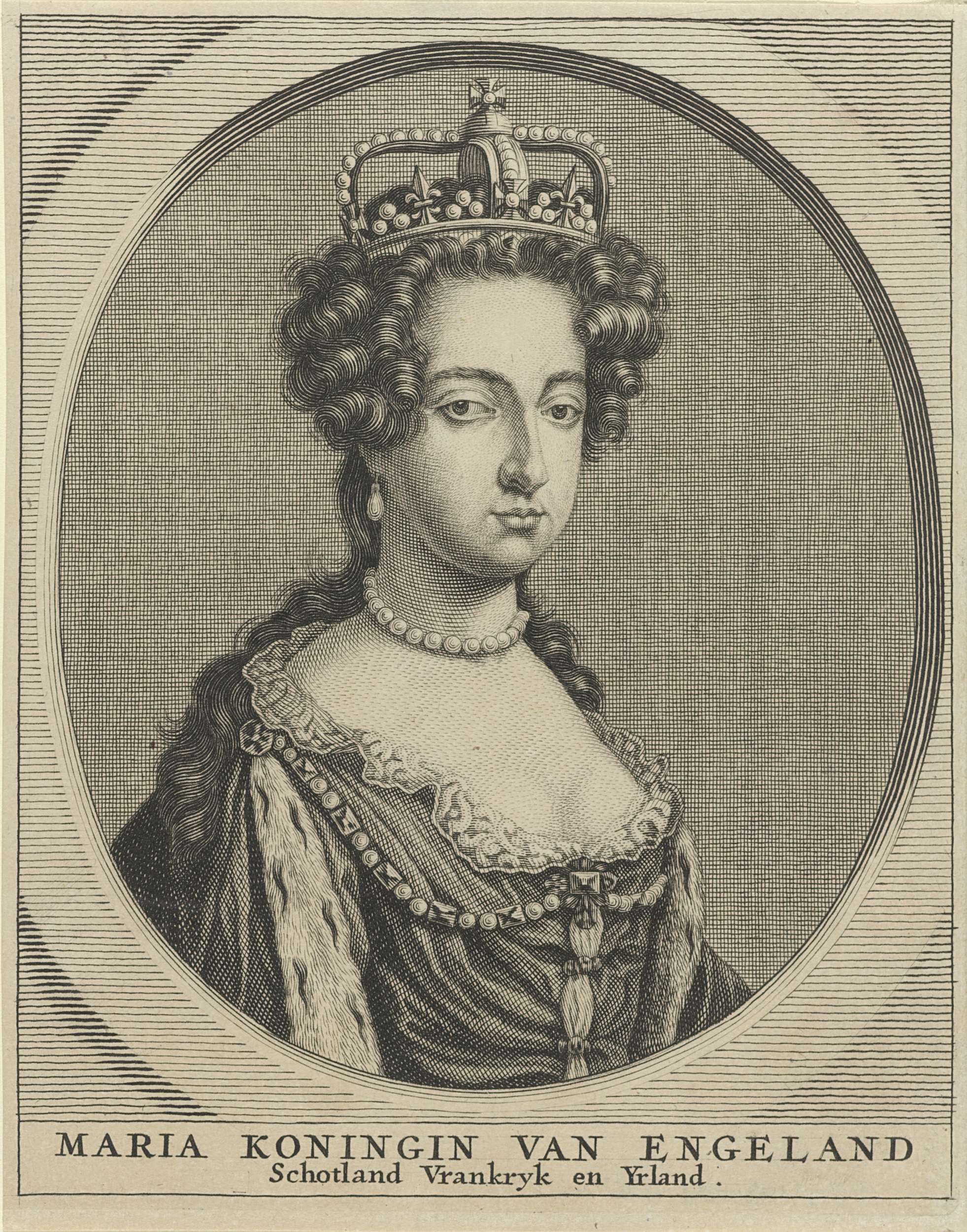 Portret van Maria II met een kroon in een ovaal. In een kader haar naam en titels.