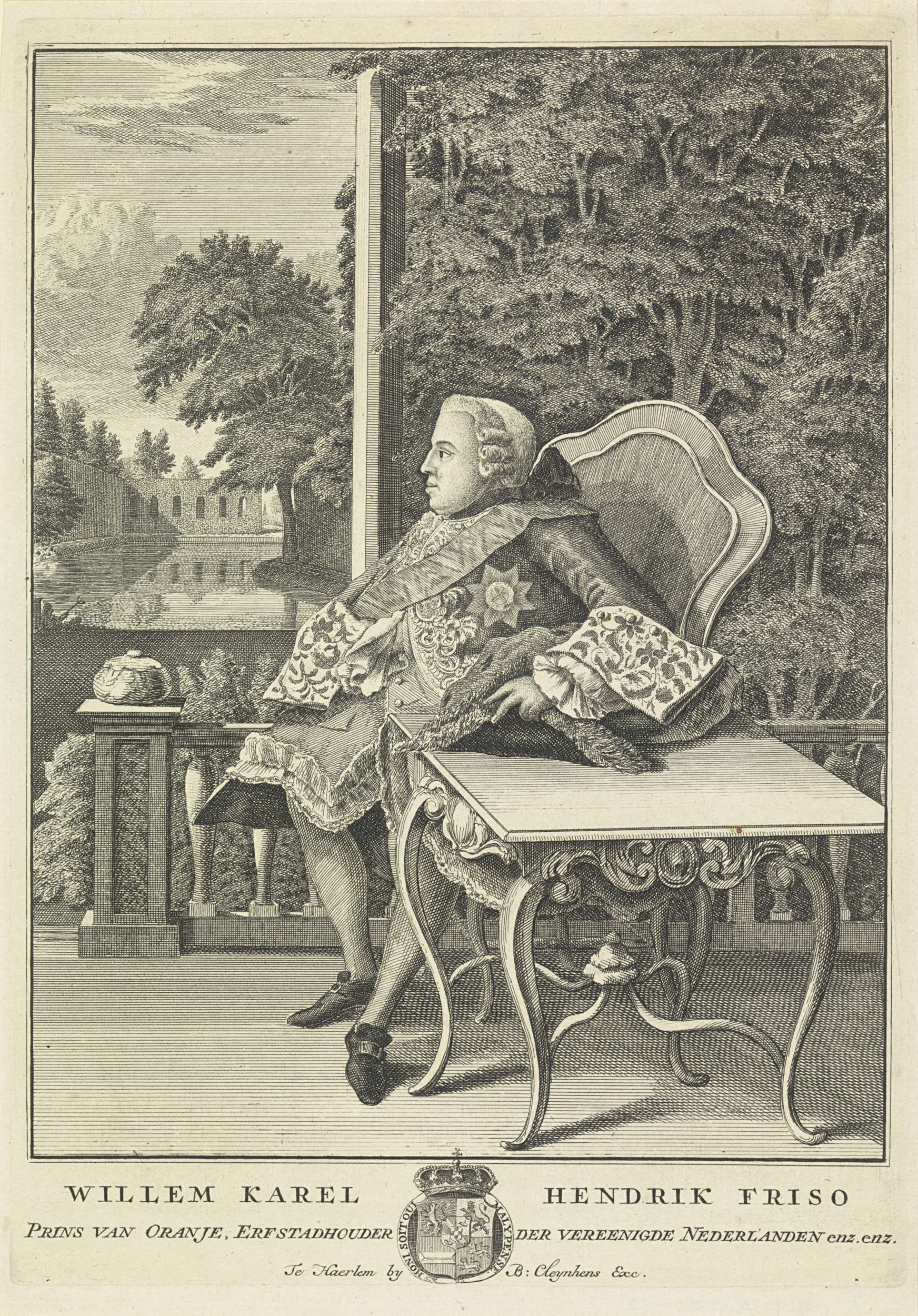 Portret van Willem IV. Hij zit naast een tafel op een terras. Op de achtergrond een vijver. Midden onder zijn wapen met een kroon, gedecoreerd met de Kousenband en het devies van de Orde van de Kousenband. In de ondermarge zijn naam en titels.