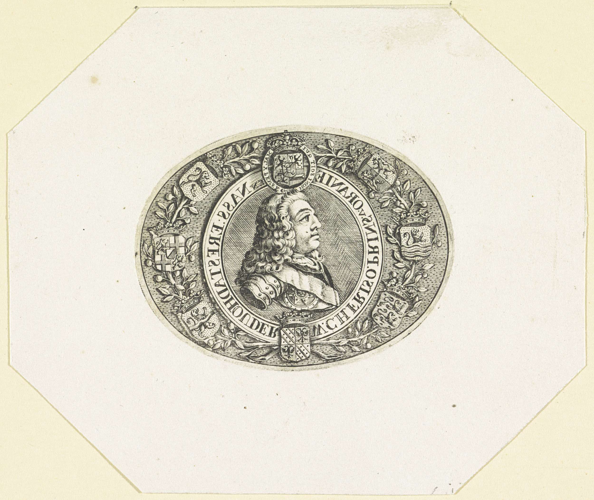 Portret van Willem IV in een cirkel met randschrift. Daar omheen een ovale omlijsting met oranjetakken, zijn wapen met een kroon, gedecoreerd met de Kousenband en het devies van de Orde van de Kousenband, en de wapens van de Zeven Provinciën. In spiegelbeeld.
