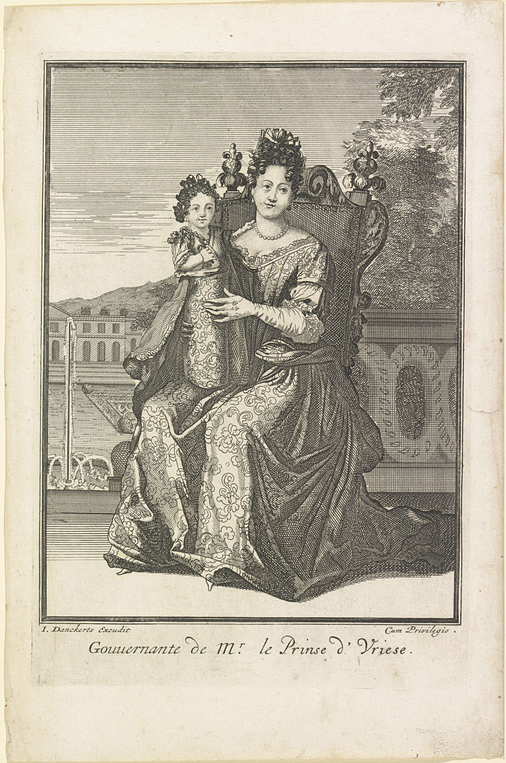 Gouvernante met op haar schoot Willem George Friso (1685-1686) of Johan Willem Friso van Nassau-Dietz (1687-1711). Op de achtergrond een tuin met een fontein.