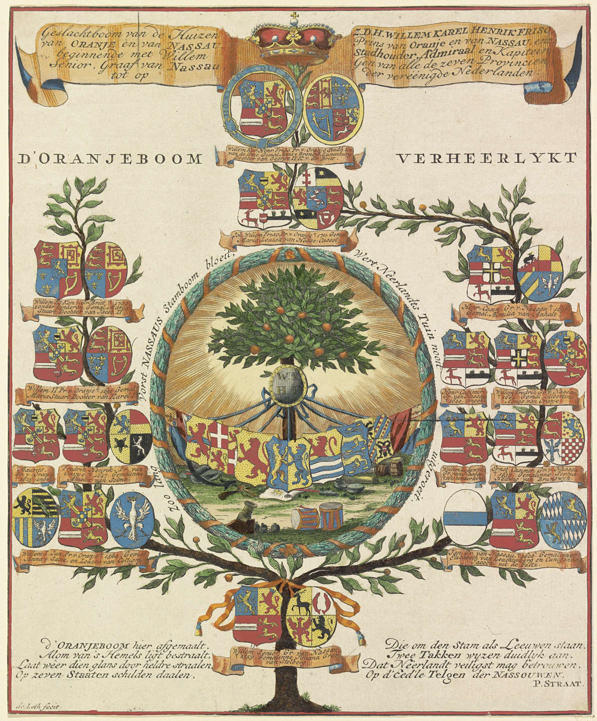 Stamboom van het Huis Oranje-Nassau, van Willem I tot en met Willem IV. In het midden de Oranjeboom in een ovaal met randschrift. Aan de stam een plakkaat met de initialen van Willem IV en een aantal wapens. Daar omheen aan de takken van een boom meerdere wapens met in cartouches namen en sterfdata. Linksonder ...
