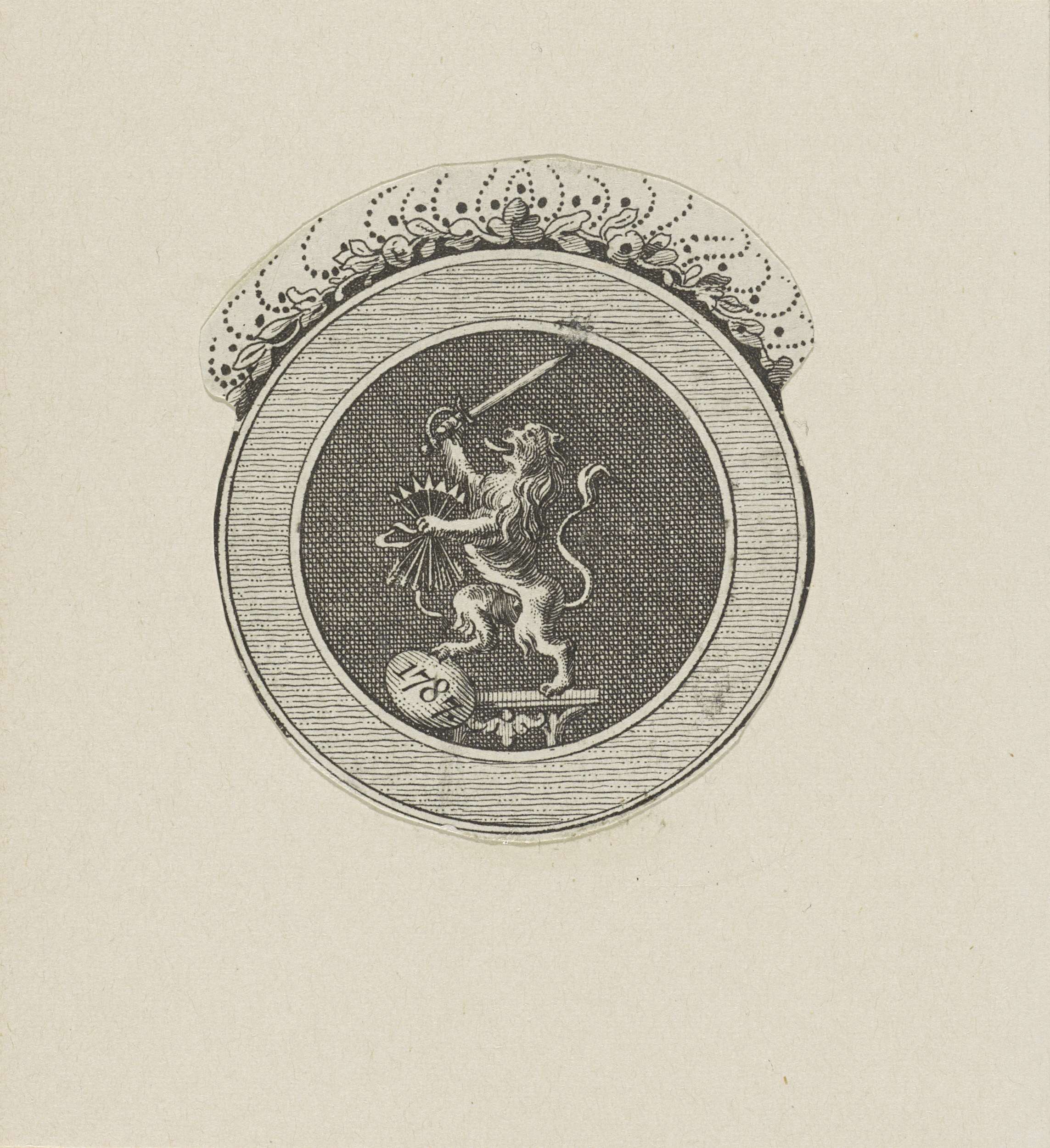 De Nederlandse Leeuw in een cirkel. In zijn linker voorpoot een bundel met zeven pijlen. In zijn rechter voorpoot een zwaard. In zijn rechter achterpoot een ovaal met het jaartal '1787'.
