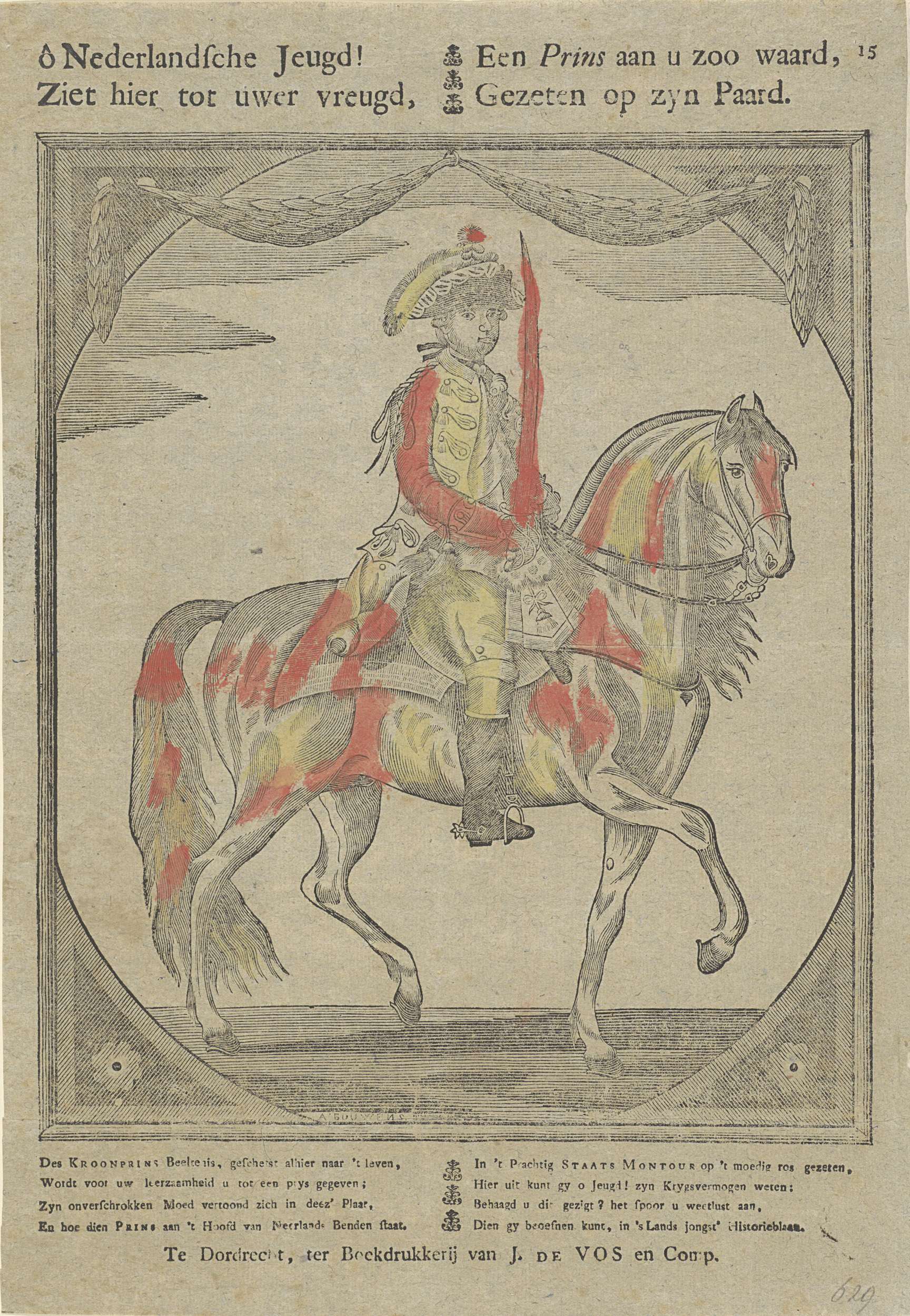 Ruiterportret van Willem V in een ovaal. In de bovenmarge twee kolommen met elk twee regels Nederlandse tekst. In de ondermarge twee kolommen met elk vier regels Nederlandse tekst. Rechtsboven '15'.