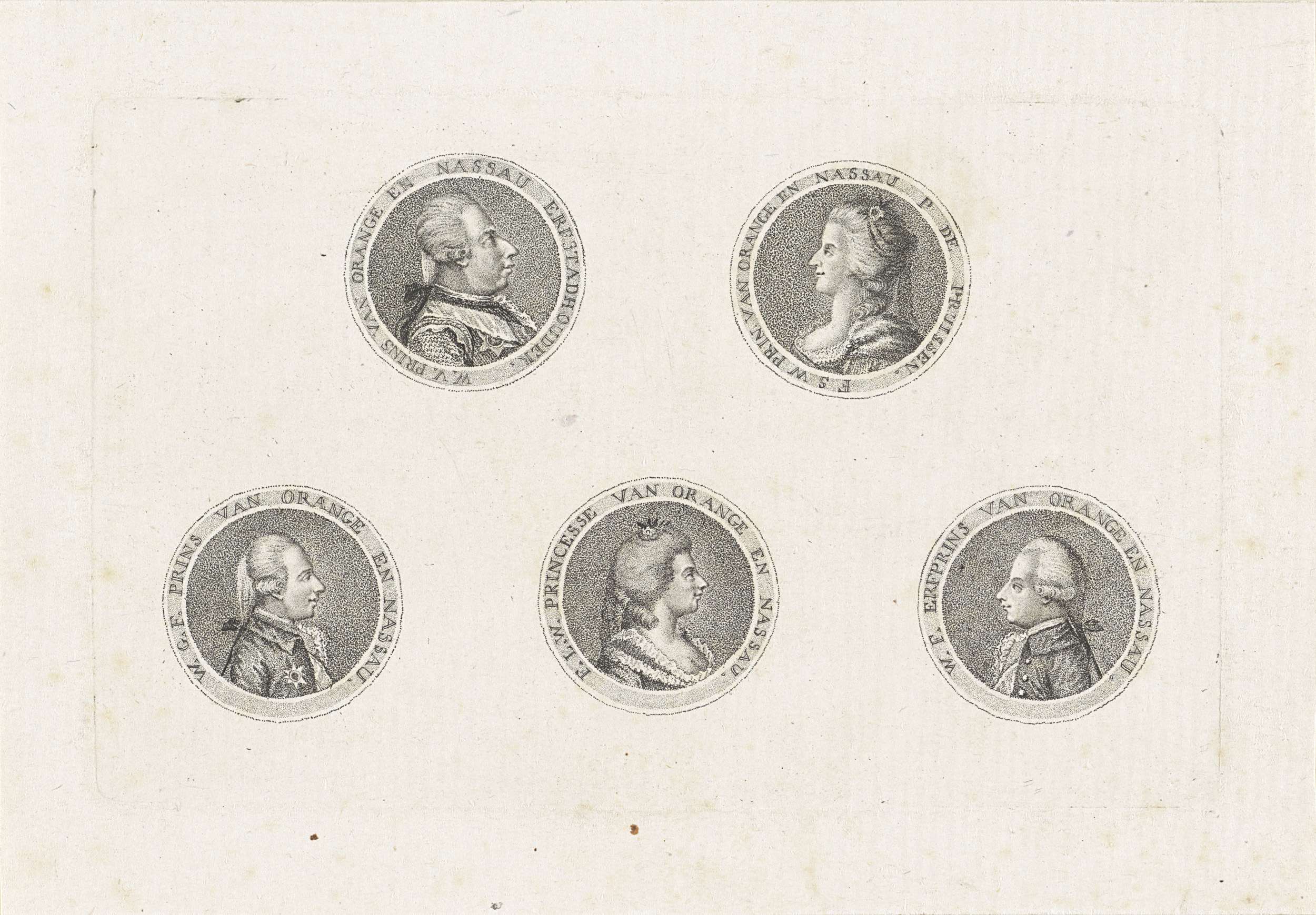 Boven: Portret van Willem V in een cirkel met randschrift links en portret van Wilhelmina in een cirkel met randschrift rechts. Onder: Portret van Frederik in een cirkel met randschrift links, portret van Louise in een cirkel met randschrift in het midden en portret van Willem I Frederik in een cirkel met randschrift rechts.